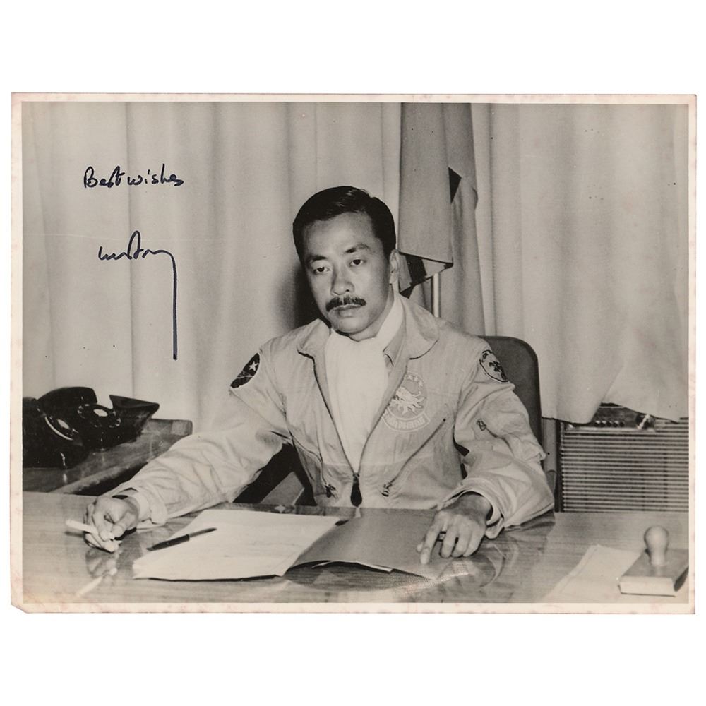 Vintage matte-finish 9.25 x 7 photo of Nguyen Cao Ky at his desk, boldly signed in black ink. In very good condition, with light spotting, and somewhat heavy creasing.