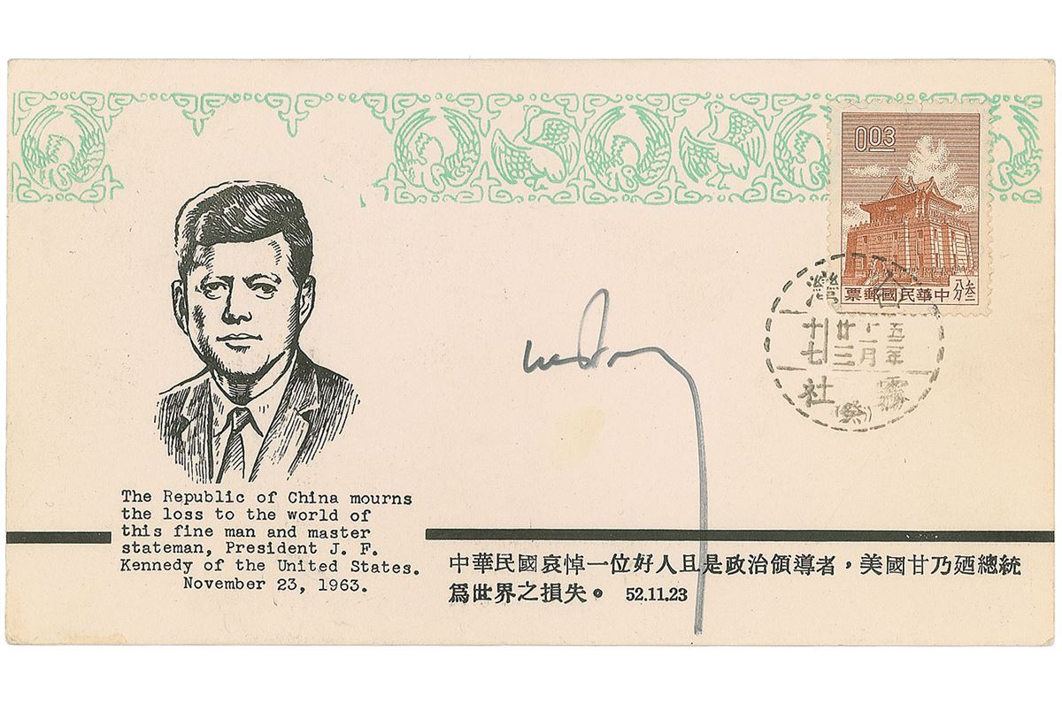 Vietnamese leader (1930-2011) who served as chief of the Vietnam Air Force in the 1960s, prime minister of South Vietnam from 1965-1967, and vice-president under Nguyen Van Thieu. Republic of China philatelic souvenir with a cachet honoring President Kennedy, signed in black felt tip. In fine condition, with trivial scattered toning.
