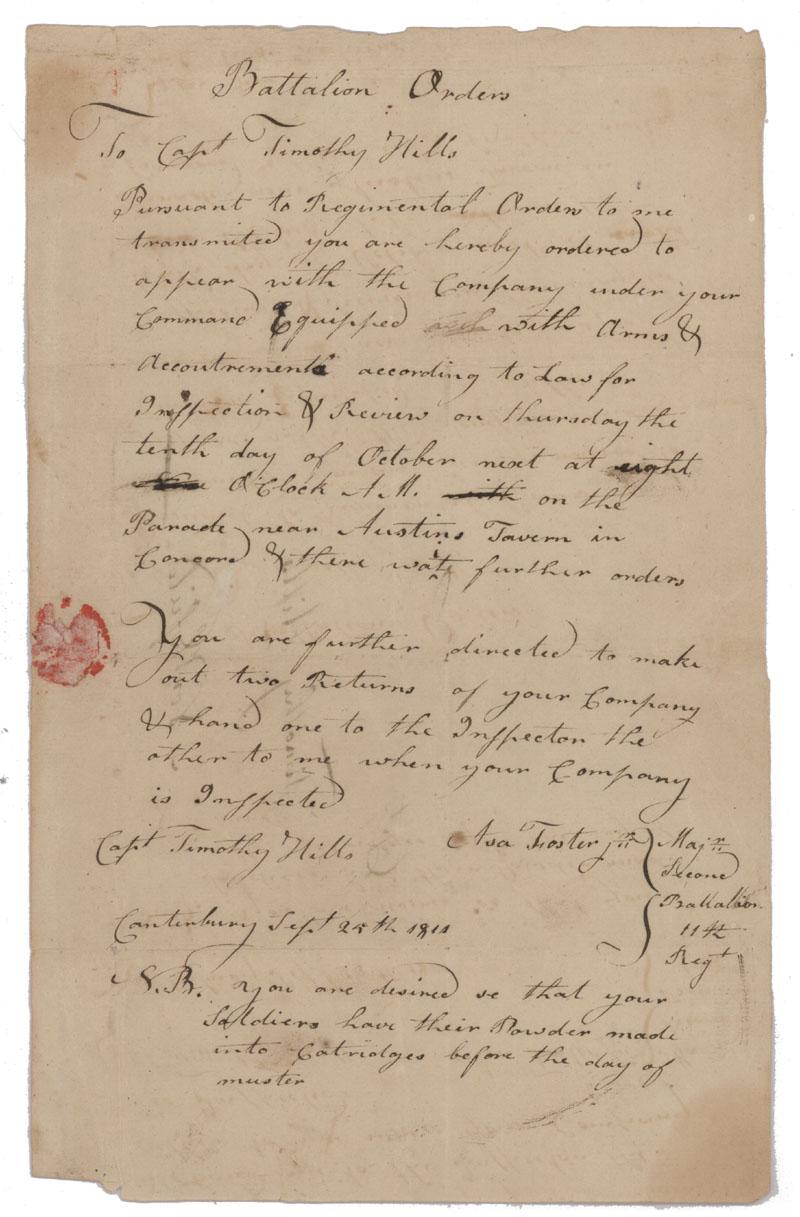 Manuscript Document. One page, 7 ¼” x 11 ½”. Canterbury [NH]. September 25, 1811. The document reads: “Pursuant to Regimental Order to me transmitted you are hereby ordered to appear with the company under your command equipped with arms & accoutrements according to law for inspect & preview on Thursday the tenth day of October next at eight O’clock A.M. on the Parade near Austin’s Tavern in Concord & there wait further orders. You are further directed to make out two Returns of your company & hand one to the inspector the other to me when your company is inspected. Asa Foster jr. Major Second Battalion 11th Regt. S.B. [?] you are desired so that your soldiers have their powder made into cartridges before the day of muster.”
