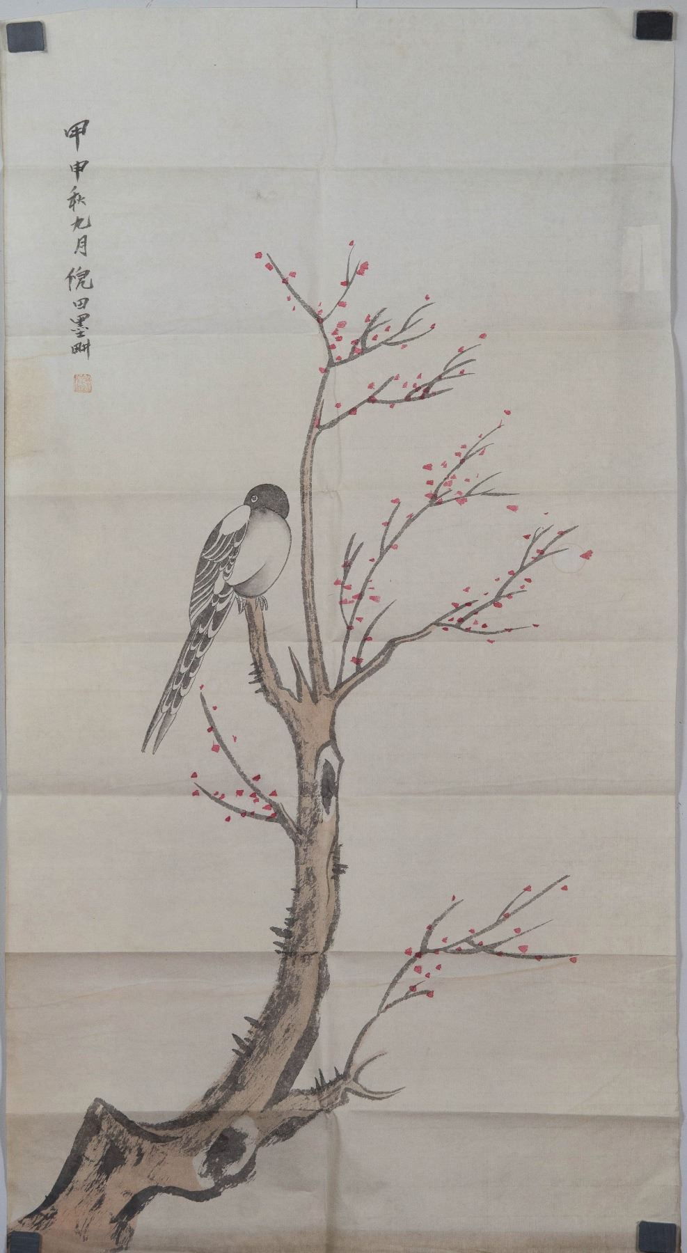 Bird and plum blossom; Chinese watercolour and ink on paper; signed Ni Tian (1855-1919) and inscribed with one artist seal; includes a red book certificate; 65 cm x 46 cm