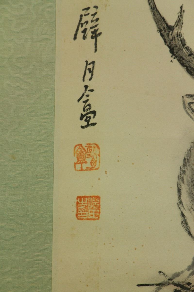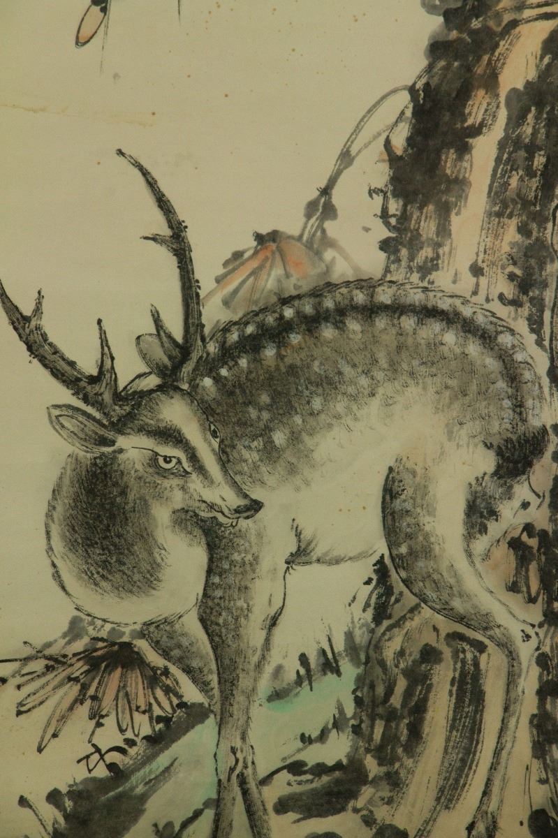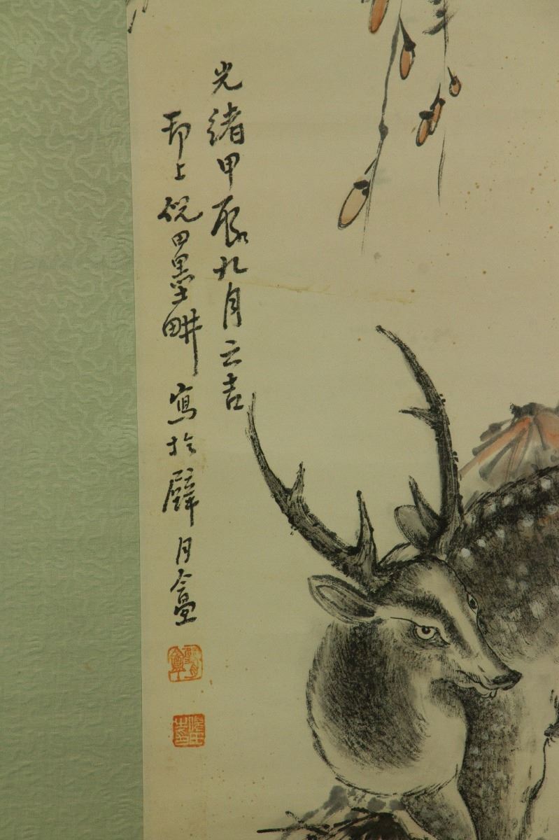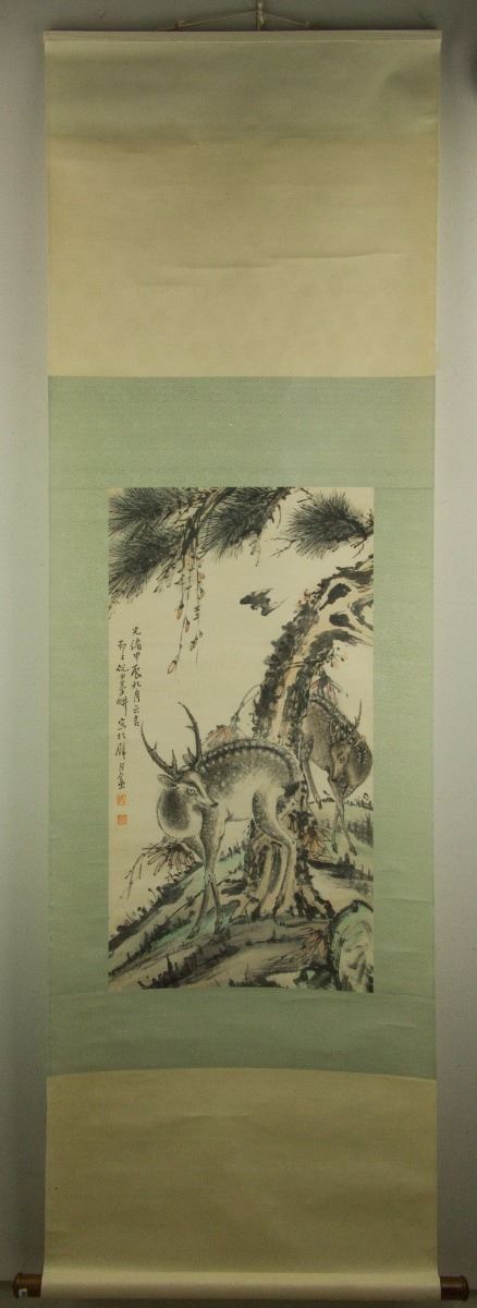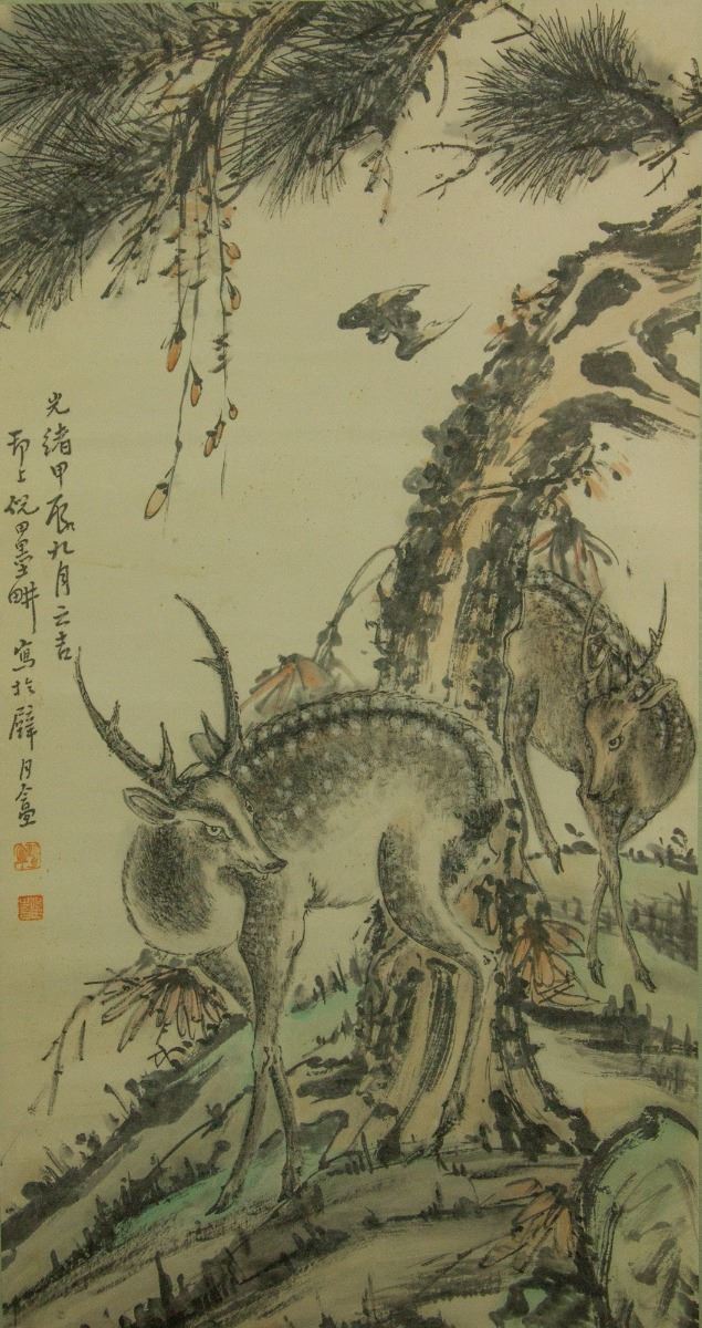 Two sika deer underneath the pine trees; Chinese ink and watercolour on paper; hanging scroll; signed Ni Tian (1855-1919); inscribed with two artist seals; 84 cm × 45 cm