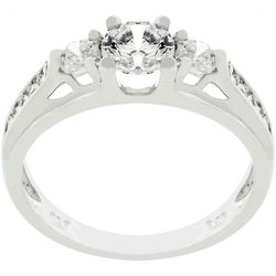 Craftsmanship and quality are at the forefront of this design so if you're shopping for the perfect look shop no more. Buy this ring and give your fashion style a glamorous personal twist! Our genuine rhodium finish is achieved using an electroplating process that coats the item with heavy layers of rhodium a close cousin to platinum which gives our jewelry a platinum luster.Base Metal: .925 Sterling SilverStyle: , Setting Type: ProngsMaterials: , Stone Cut: RoundCarat Weight: .9 (ct)Color: , Plating Color: Silvertone FinishChain Clasp: 12.00Ring Band Width: 1.5 mmBracelet Size: 19 mm L x 5 mm W x 4.5 mm HStone Size: 5 mm| 3 mm| 1.3 mmType: Ring