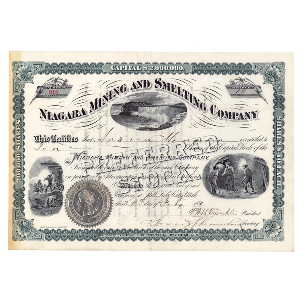 1891, Utah. Stock certificate for 10 shares. Green/Black with attached embossed silver company seal. Top center vignette of Niagara Falls, vignettes at left and right of miners at work. Glue residue at left margin from stub. Uncancelled and fine.