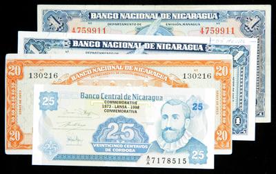 Nicaragua. Miscellaneous Lot:,1 Cordoba, Series of 1951. P-91b; 1 Cordoba, Series of 1953. P-99a. graffitti in upper right corner; 20 Cordobas, Series of 1953. P-102a; 25 Centavos, 1973-1998 Commemorative issue. Lot of 4 notes. Extremely Fine To Uncirculated.