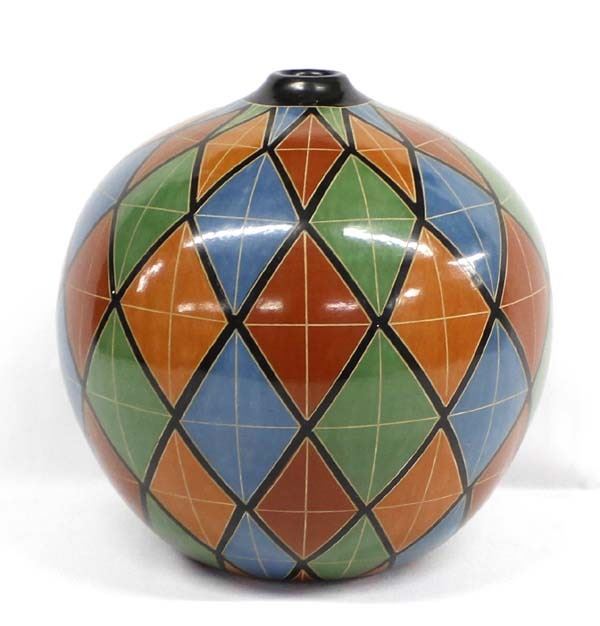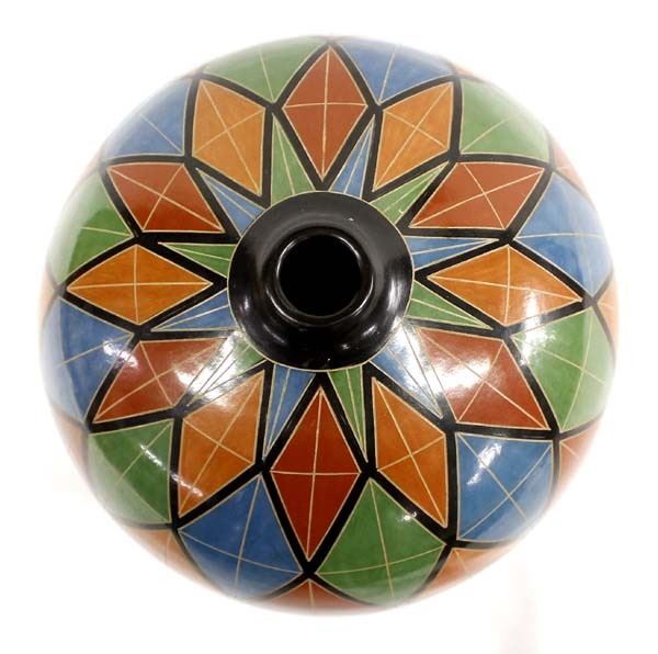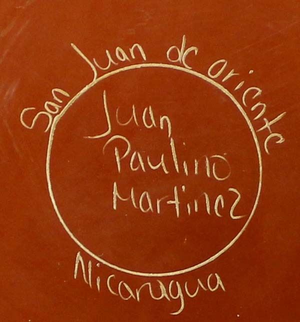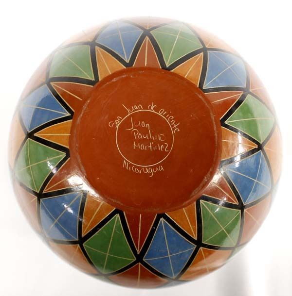 Phenomenal Nicaraguan Pottery Vase by Juan Paulino Martinez, measures 8'' x 9'' and is signed on the bottom, beautifully carved lines and designs and stunning colors, FYI: ''Juan is 41 years old and has been making pottery for the past 20 years. He produces extremely intricate geometric works with exacting detail.''