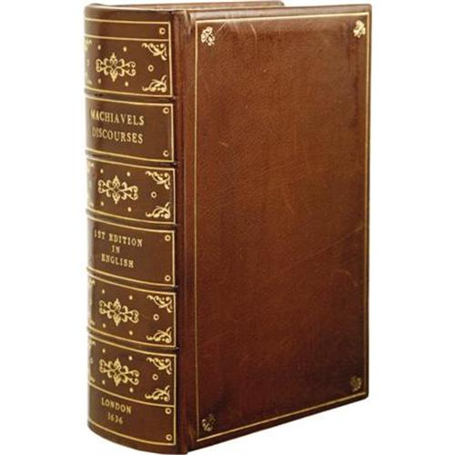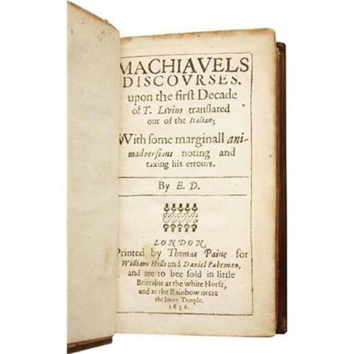 <B>Niccolo Machiavelli: </B></I><B><I>Machiavels Discourses upon the first Decade of T. Livius translated out of the Italian</B></I></B></I> <I>With some marginall animadversions noting and taxing his errours.</B></I> <B>Translated by Edward Dacres.</B></I> (London: By Thomas Paine for William Hills and Daniel Pakeman, 1636), first English edition, 646 pages, later full calf binding with tan leather title plate affixed to the spine reading <I>MACHIAVELS DISCOURSES</B></I> in gilt, 16mo (3.75" x 6"), clear Mylar protective jacket. Machiavelli is most famous for his masterpiece of political theory, <I>The Prince,</B></I> where he espoused the notion that for a monarchical leader of a principality, " i t is best to be both feared and loved, however, if one cannot be both it is better to be feared than loved." Offered here is Machiavelli's <I>Discourses on Livy,</B></I> his seminal commentary on Titus Livy's history of Roman republicanism. <I>Discourses on Livy</B></I> became very popular after this very translation was released to the English-speaking world in 1636. In the work, Machiavelli focuses his critical eye on the structure of, warfare by, and the role of individual leadership in a modern republic, seeming to depart from many of the ideas he had expounded a few years earlier in <I>The Prince.</B></I> The copy of the 1636 first English translation presented here is in good condition, with minimal wear to the edges and spine, bumped corners, very lightly rubbed boards, and some fading and rubbing to the gilt on the title plate. The interior textblock is sound, with minor wear to the endpapers, including miniscule chipping to the first two flyleaves, spotty foxing to various pages, and modern pencil notations on the front and rear free endpapers. The book comes housed in a full leather solander box with gilt titles on the spine, gilt decoration on the boards and light cloth at the edges. Machiavelli is one of the giants of political theory, and <I>Discourses on Livy,</B></I> according to Jean-Jacques Rousseau, is more representative of Machiavelli's philosophy than even <I>The Prince.</B></I> A finer copy of the book would be very difficult to find.<BR><BR><b>Shipping:</b> Books & Catalogs (<a target="_blank" href="http://www.heritageauctions.com/common/shipping.php">view shipping information</a>)