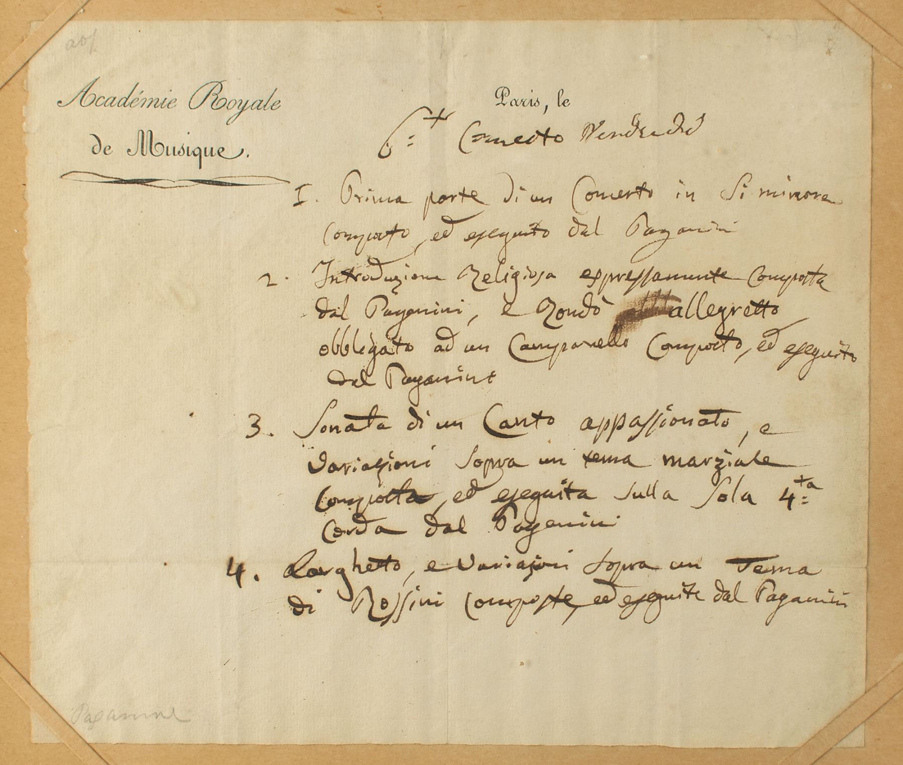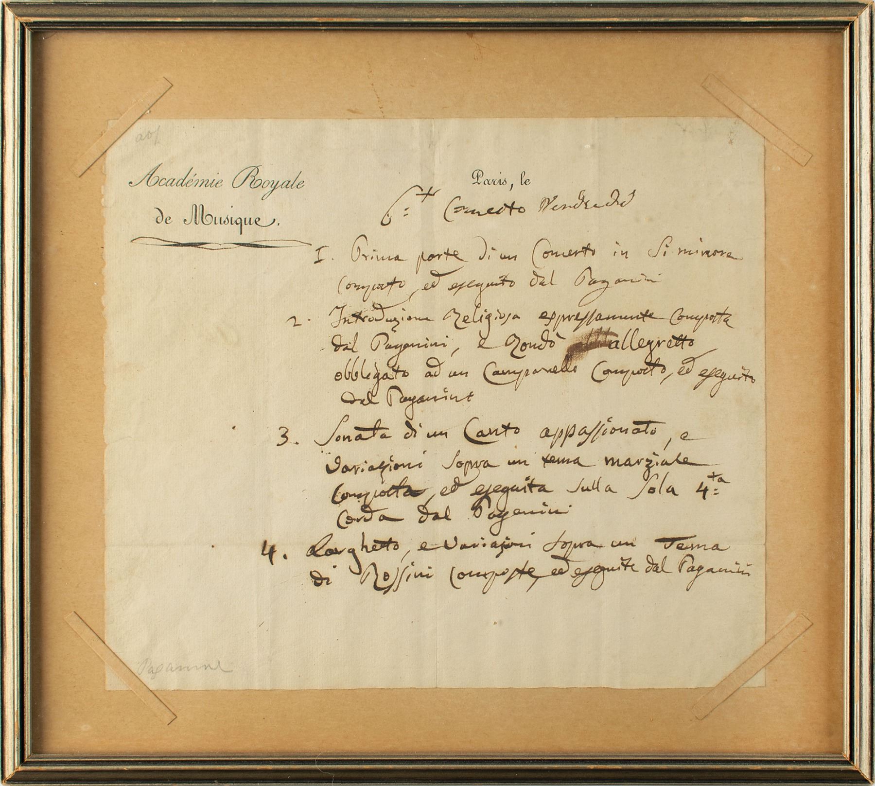 Handwritten plan for a concert penned by Paganini, signed five times, "Paganini," one page, 7.75 x 6.75, Academie Royale de Musique letterhead, no date. Paganini outlines a plan for a Friday concert, writing four lines in Italian, each finishing with his surname. Among the pieces are a religious introduction, an impassioned sonata played only on his fourth string, and a theme by Rossini. In part: "1. Prima parte di un Concerto in Si minora…eseguito del Paganini, 2. Introduzione religiosa expressamente comporta del Paganini, e rondo allegretto…eseguito del Paganini, 3. Sonata di un Canto appassionato…eseguito sulla sola 4ta corda del Paganini, 4. Larghetto, e variazoni sopra un tema di Rossini…eseguito del Paganini." Mounted and framed to an overall size of 10.25 x 9.25. In fine condition. A marvelous piece that embodies Paganini's creativity on the stage.