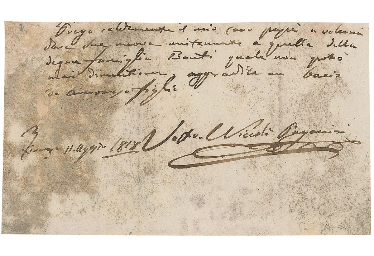 Remarkable Italian violinist and composer (1782–1840) generally regarded as the greatest virtuoso in the history of the instrument. Paganini’s striking appearance and seemingly superhuman skill on the instrument led many to believe that he was in league with the devil, an image he did nothing to dispel. His fiendishly demanding (and sometimes beautiful) works for the violin, particularly the Caprices, remain a cornerstone of the repertoire. ALS in Italian, signed “Your Niccoló Paganini,” one page, 7 x 4, August 11, 1818. Translated in full: “I pray warmly my dear Papa to give me his news as well as those of the Banti family, that I can never forget, and please accept the kiss of a loving son.” Letter has been backed with an identical size sheet. In very good condition, with some light vertical folds, some thin areas to page, and scattered light staining.