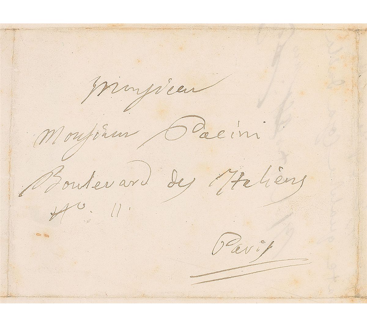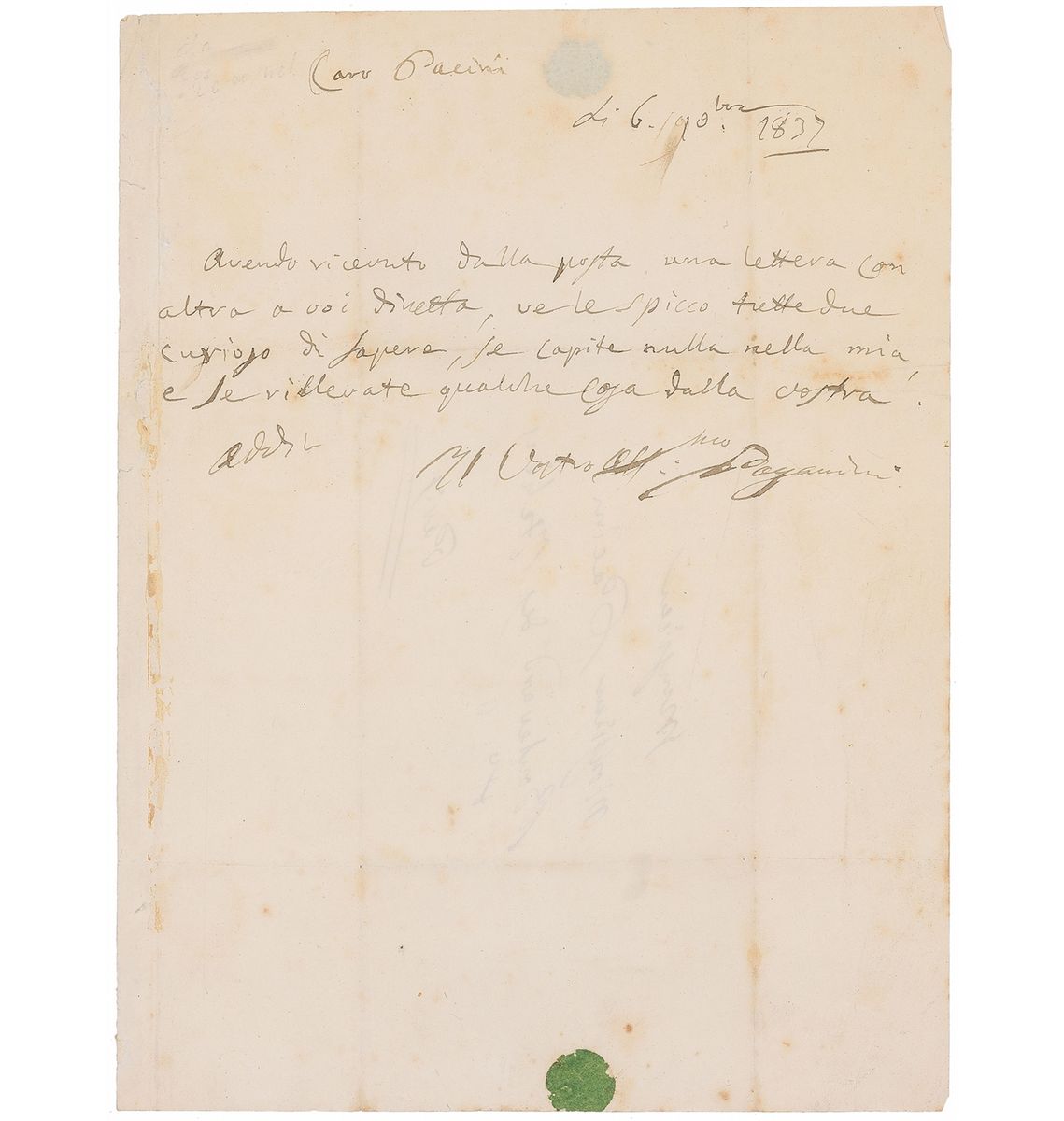ALS in Italian, signed “Paganini,” one page, 7.5 x 9.5, October 6, 1837. Untranslated letter to his publisher Antonio Pacini in Paris regarding a mistakenly delivered letter received in the post. Also addressed on the reverse in Paganini’s own hand. In very good condition, with intersecting folds (one vertical fold passing through a single letter of the signature), scattered foxing, toned adhesive remnants to left edge, and show-through to the upper left from slight surface loss to reverse.