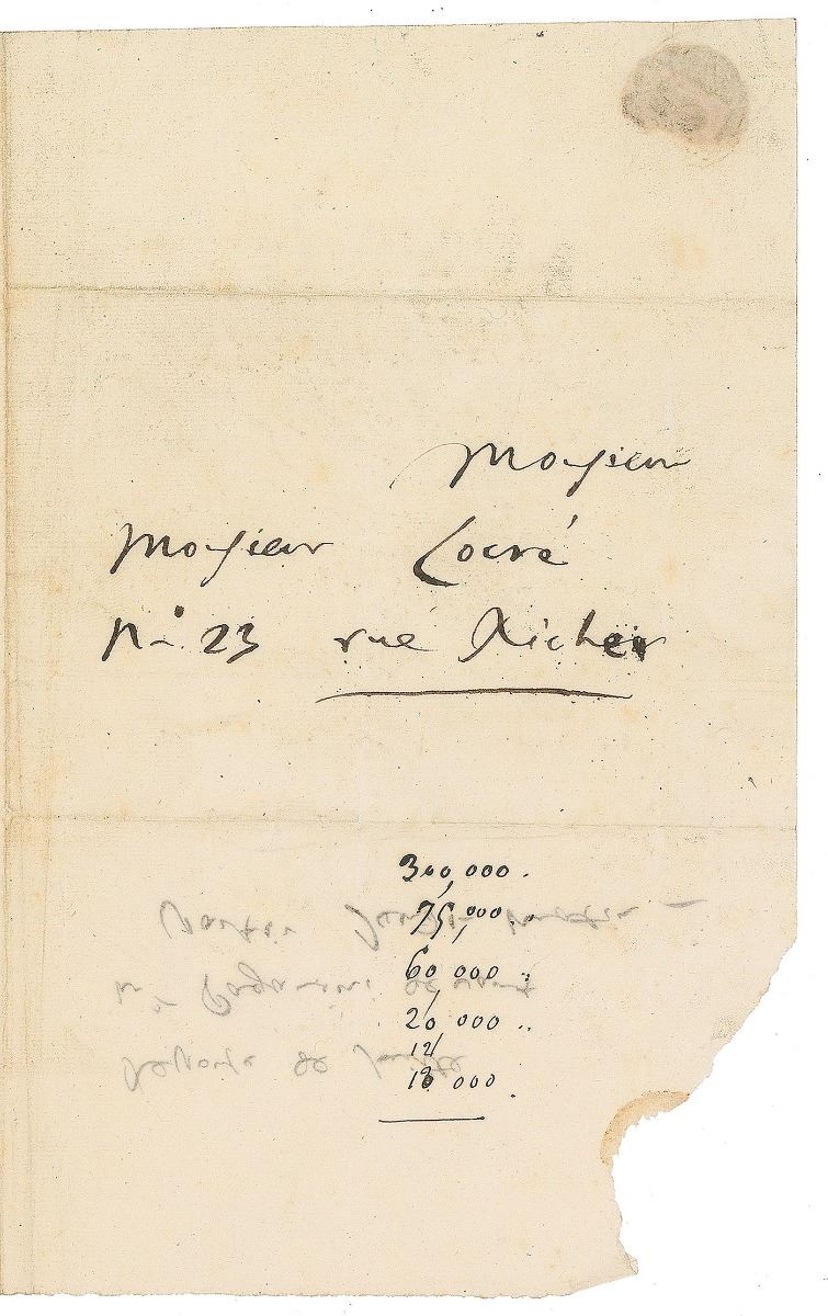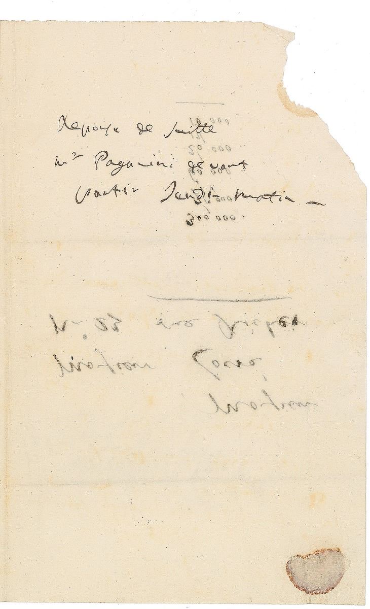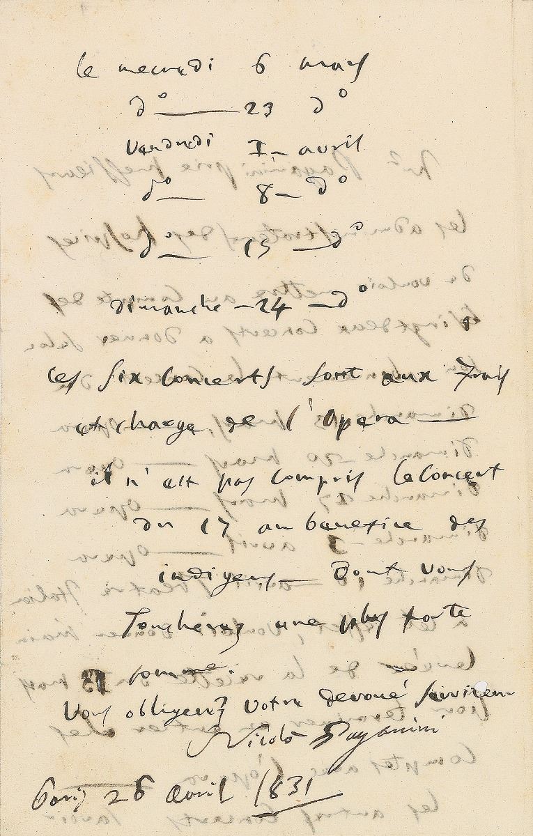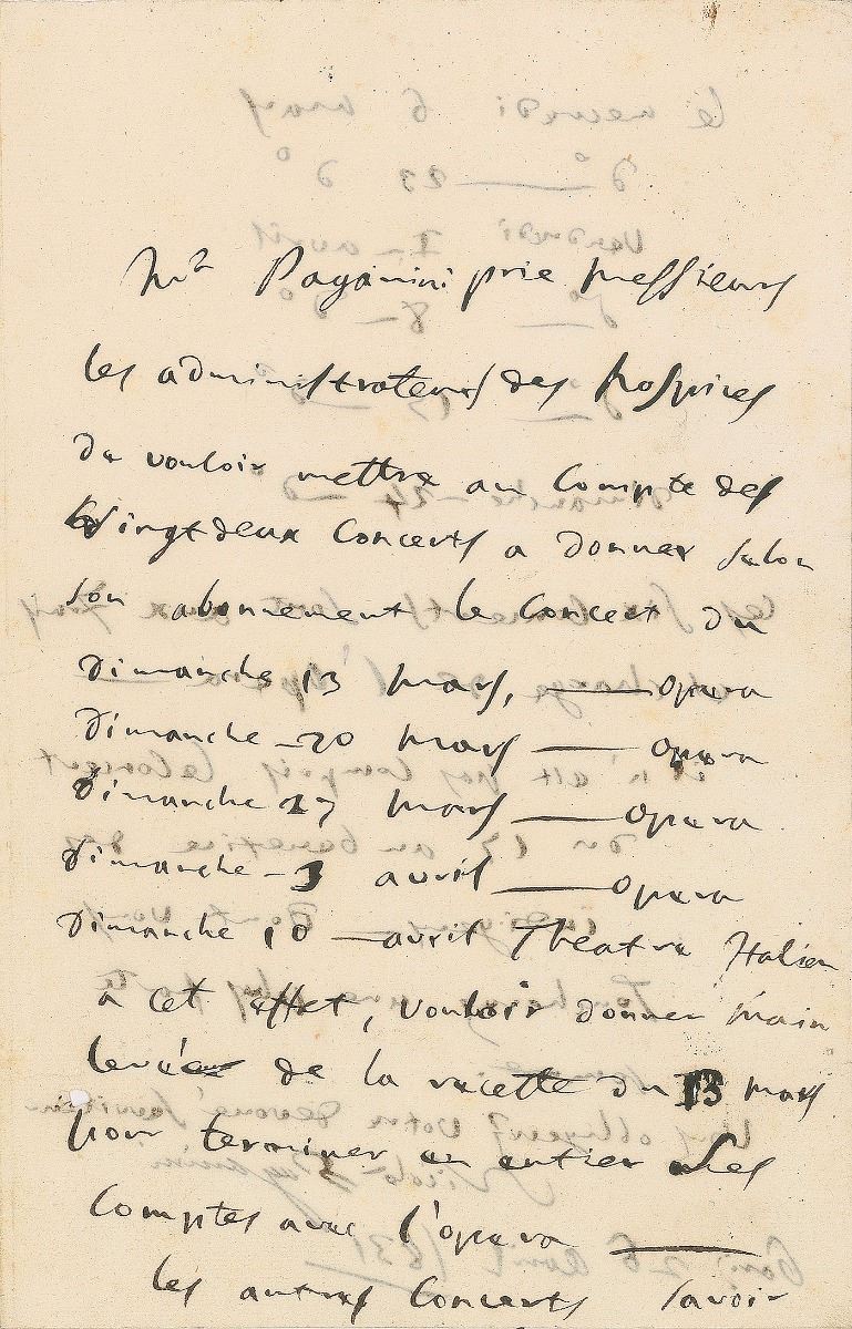 Rare third-person ALS in French, signed twice, "Mr. Paganini," and once, “Nicolo Paganini,” one page both sides, 5 x 8, April 26, 1831. Letter to the administrators of the Hospices Civils, in part (translated): "Mr. Paganini asks the Administrators of the Hospices to take account of the twenty-two concerts to be given according to his subscription: Sunday, 13 March—Opera. Sunday, 20 March—Opera. Sunday, 27 March—Opera. Sunday, 3 April—Opera. Sunday, 10 April—Theatre Italien. To that effect, he wants to get the earnings of the 13th of March to finish his accounts with the Opera. The other…six concerts are in charge of the Opera. The concert of the 17th is not included. It is in benefit of poor people, from which you will receive a large sum." On the adjoining leaf, Paganini writes, "Return as soon as possible, Mr. Paganini has to leave Thursday morning." In fine condition, with writing showing through from opposing sides, and some paper loss to the integral address leaf. Paganini gave his first concert in Paris on March 9, 1831, and the concert series drew frenzied crowds despite doubled ticket prices at the Paris Opera. A remarkable letter from a significant moment in Paganini's legendary career.