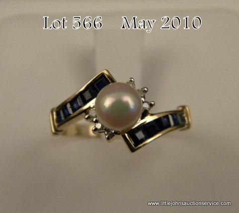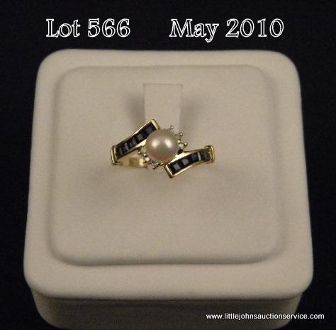 Nice 14 karat yellow gold ladies ring set with a round pearl averaging 6.00 mm in diameter and channel set with fine baguette color sapphires and diamonds. Retail $850.00 Estimate $200-$400