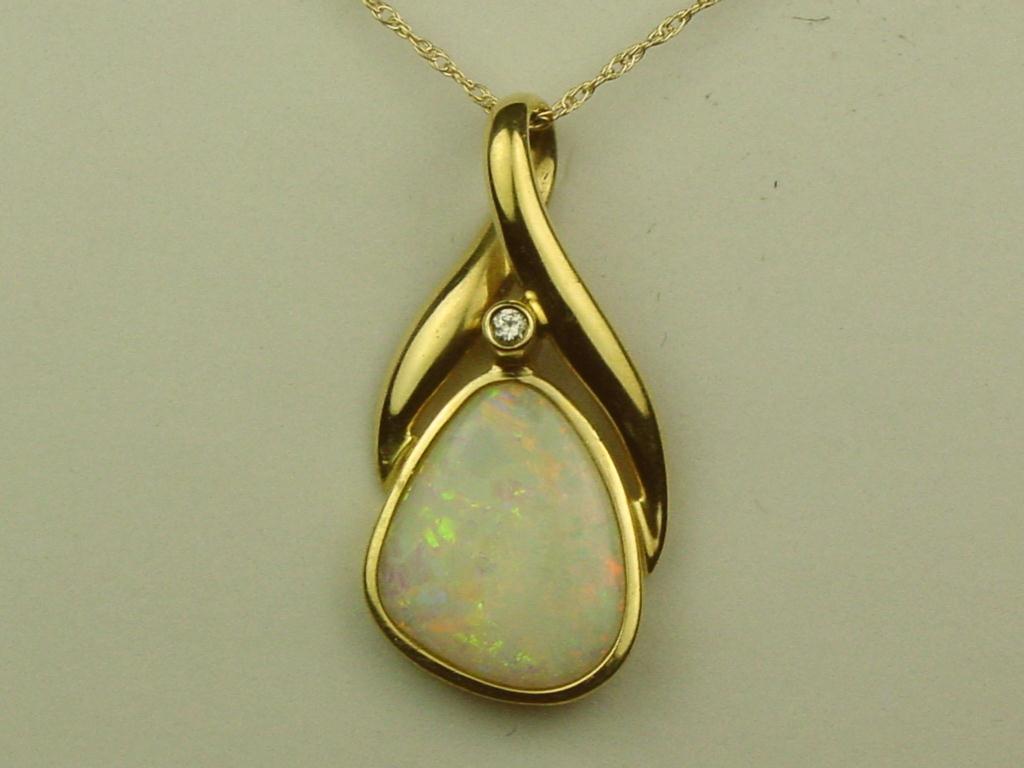 Nice 14K YG Ladies Custom Made Pendant Bezel set with a fine play of color Australian opal and bezel set diamond. Retail $1,250.00Bezel set with a fine play of color Australian opal and bezel set diamond. Retail $1,250.00