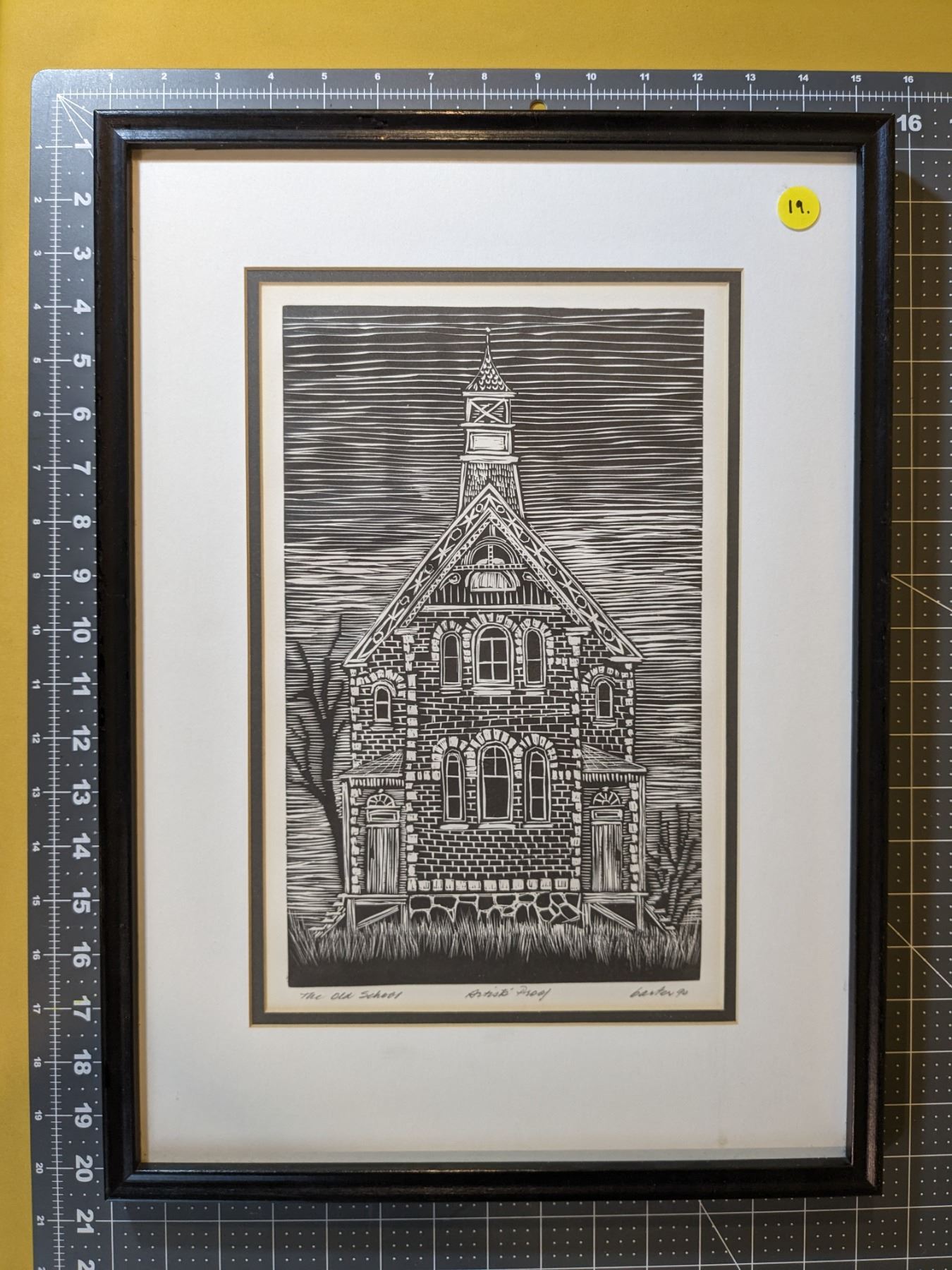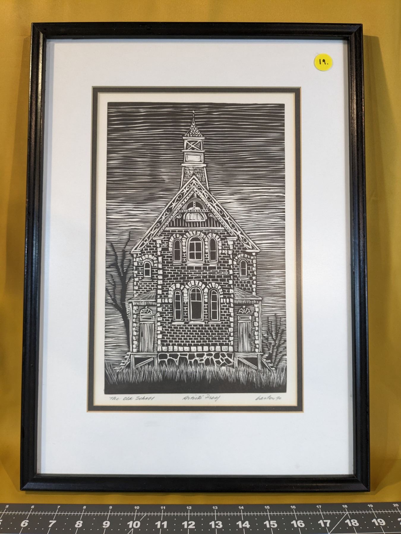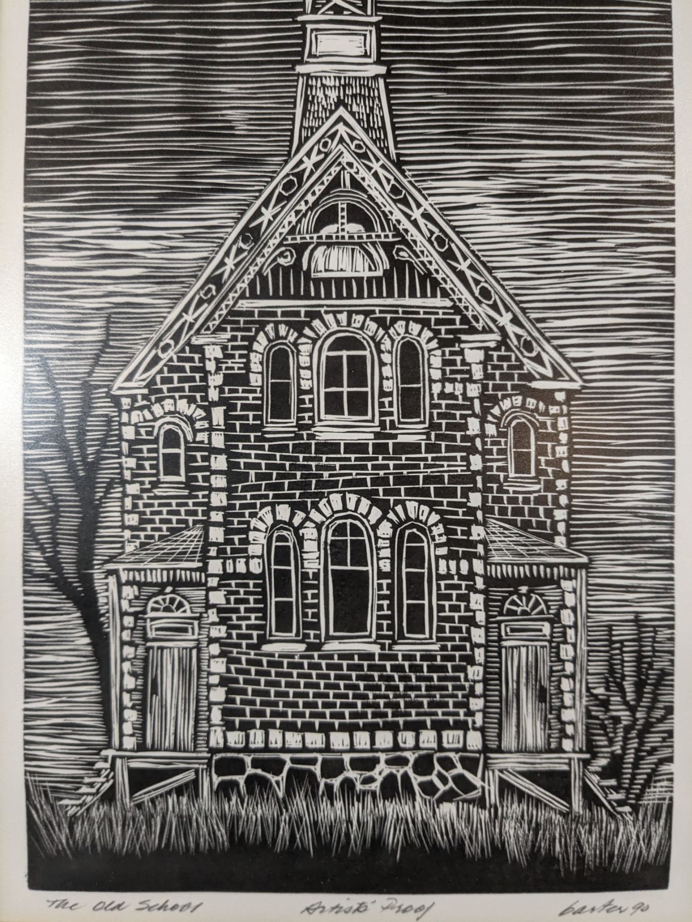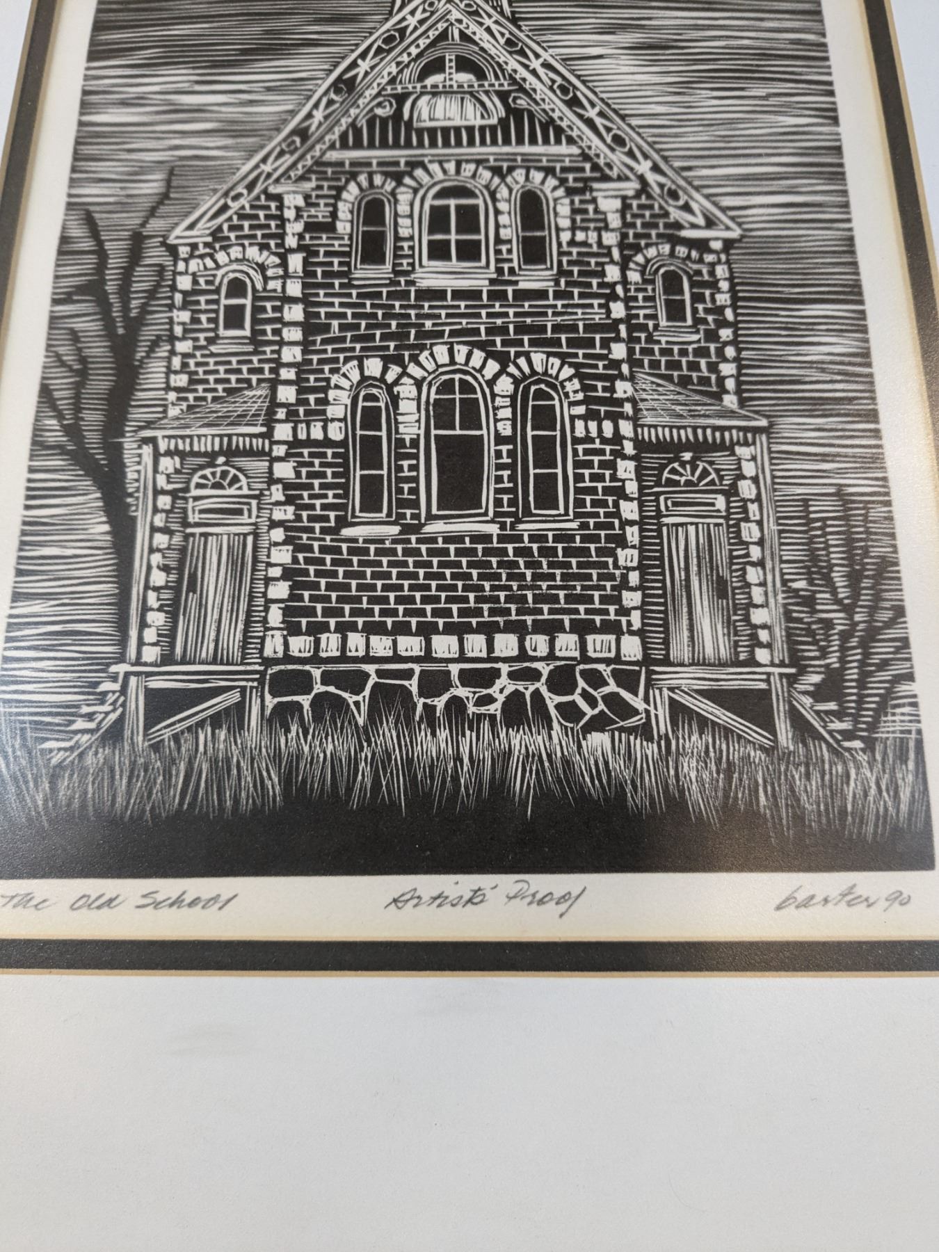Nice 19 in x 14 in woodblock print, 'the old school' signed by artist.