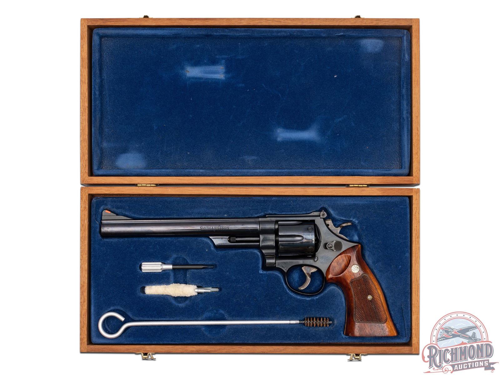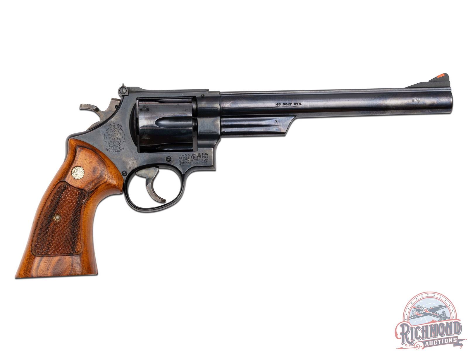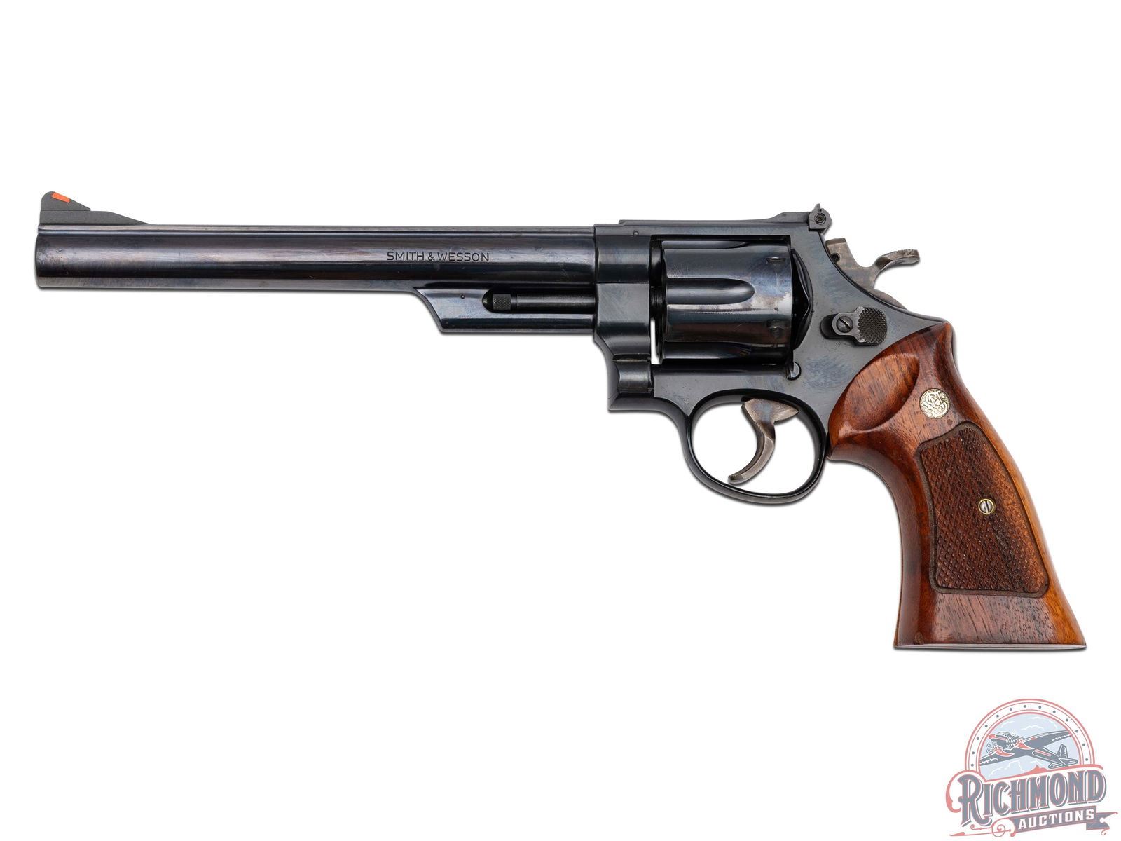 Manufactured in 1980. This classic double/single action revolver features an 8" barrel with rear adjustable white outlined notch sight and red highlighted front ramp. Blued finish with a 6-round swing-out fluted cylinder. case-hardened hammer and trigger. Fitted with factory walnut checkered grips with silver tone S&W logo medallions. Comes in a nice oak presentation case with original factory cleaning tools, manual, paperwork and original receipt. CALIBER: 45 COLT. S/N: N659586. FFL STATUS: Modern.