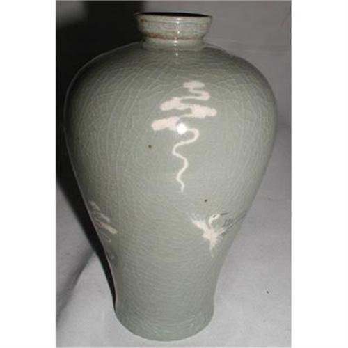 Very good antique 19th c. Korean celadon small vase with inlay decorations of cranes with sand adhisitives on the footing.