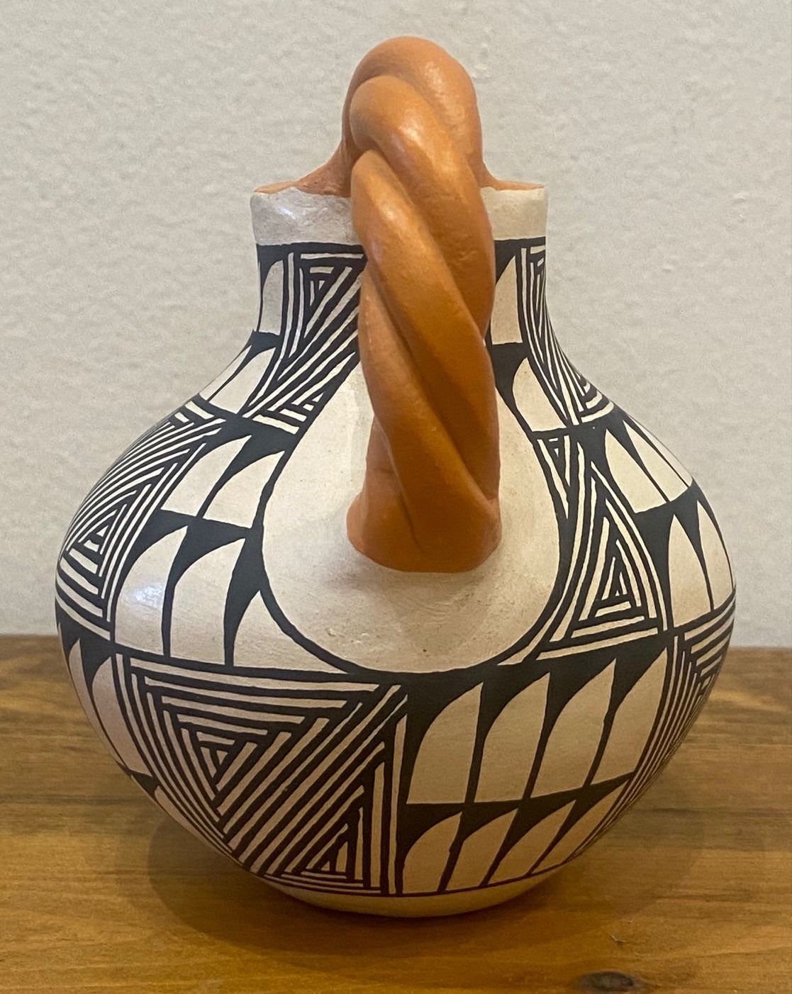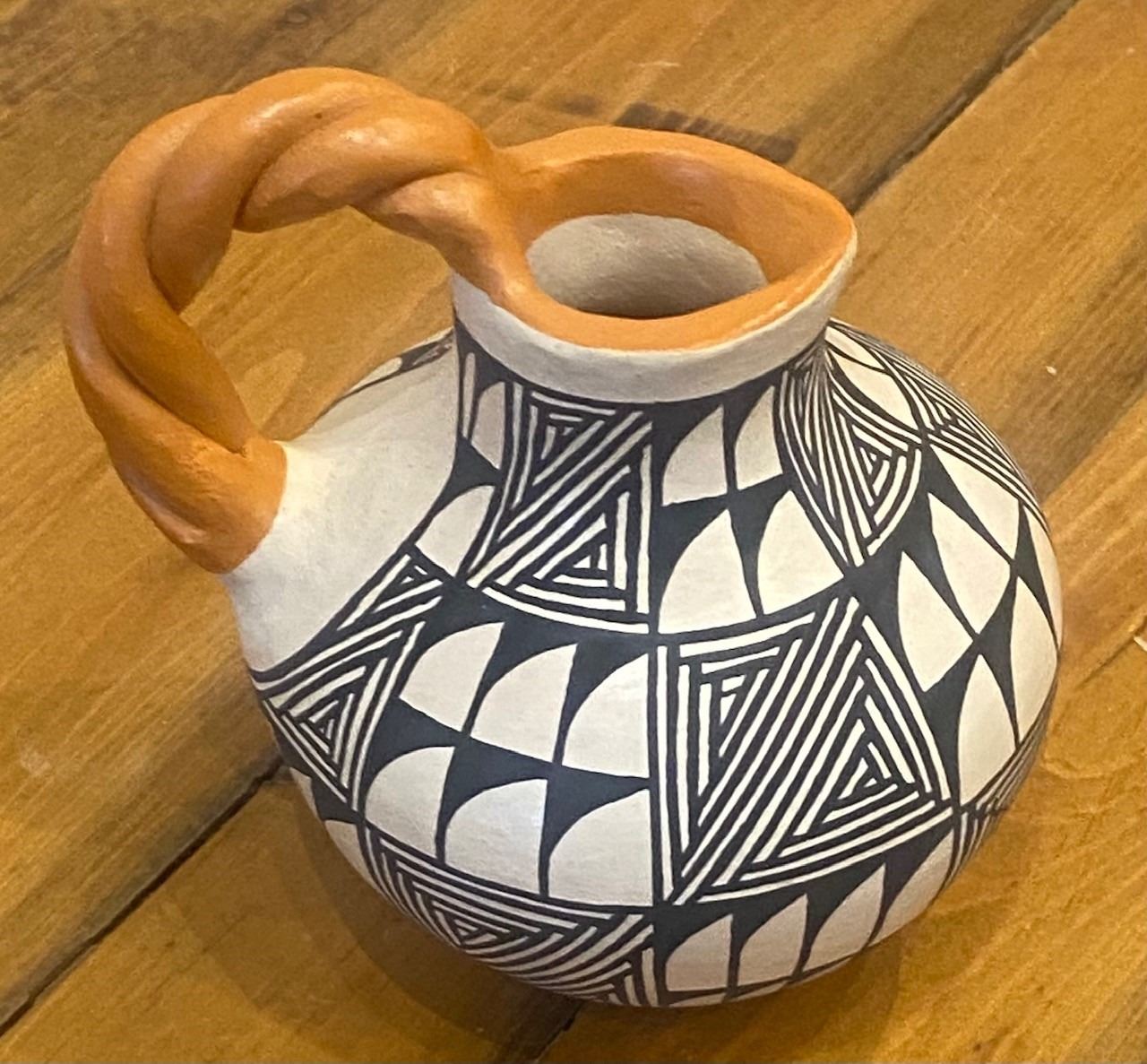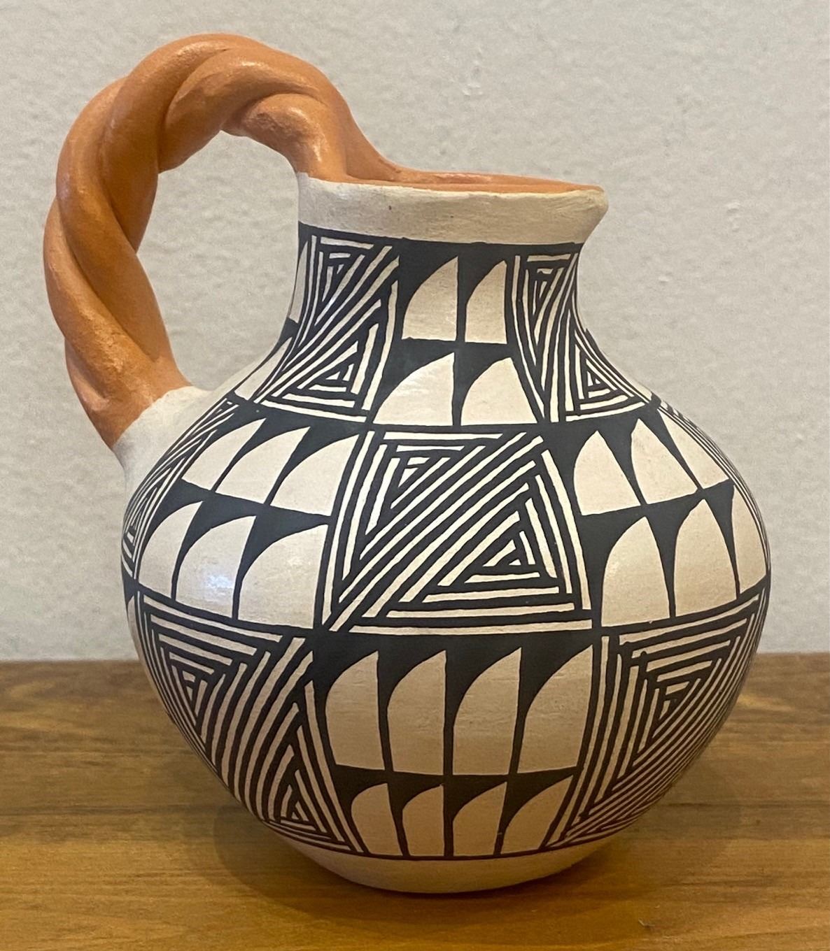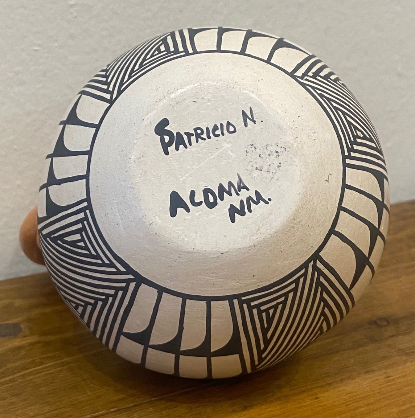 This Acoma Water Pitcher is signed by Stephanie Patricio Nez. Circa 2000. Measures 4.25-inches tall (including handle) and 4-inches wide.