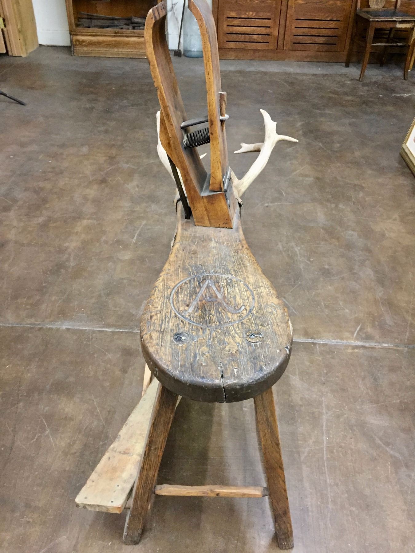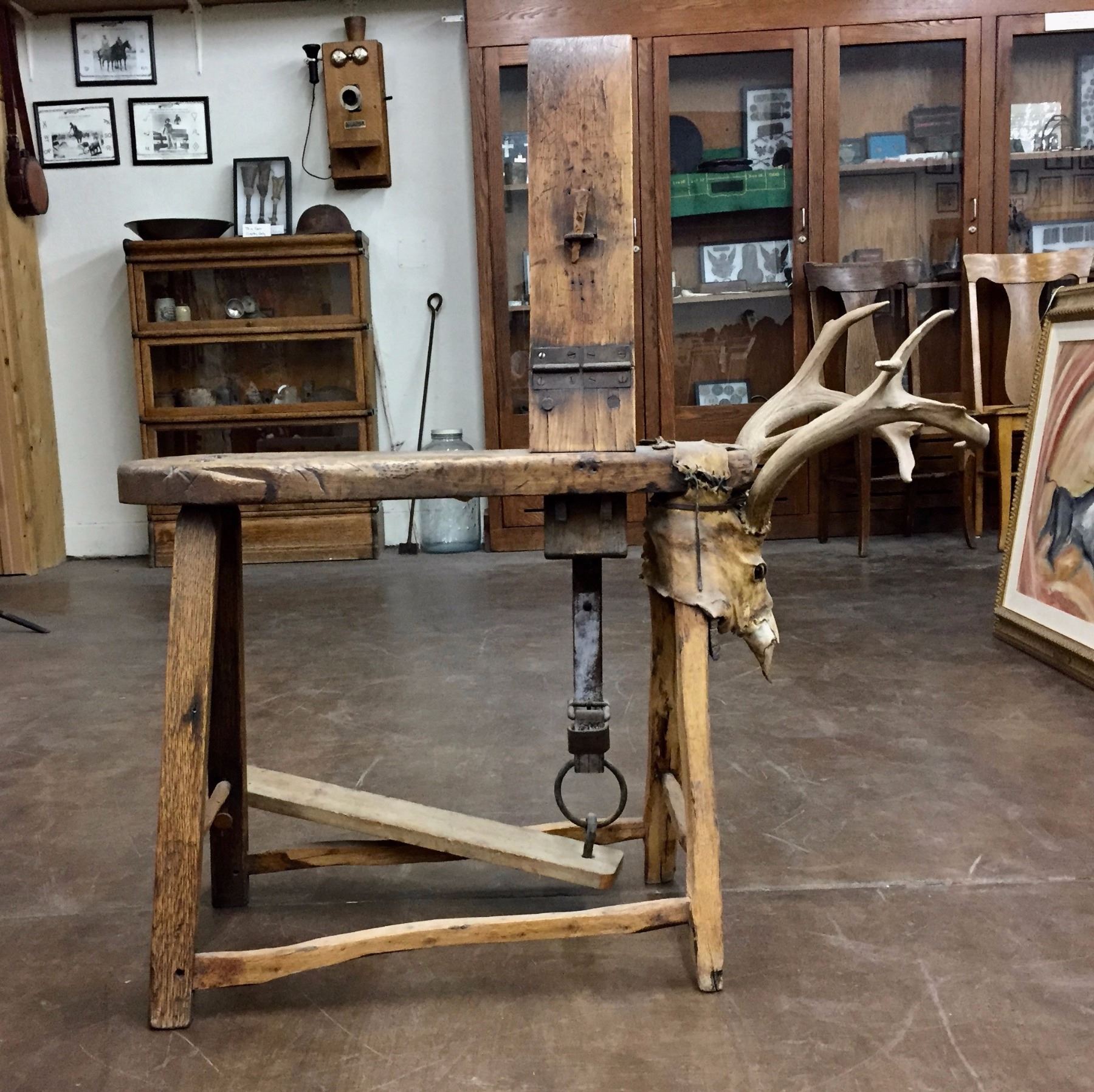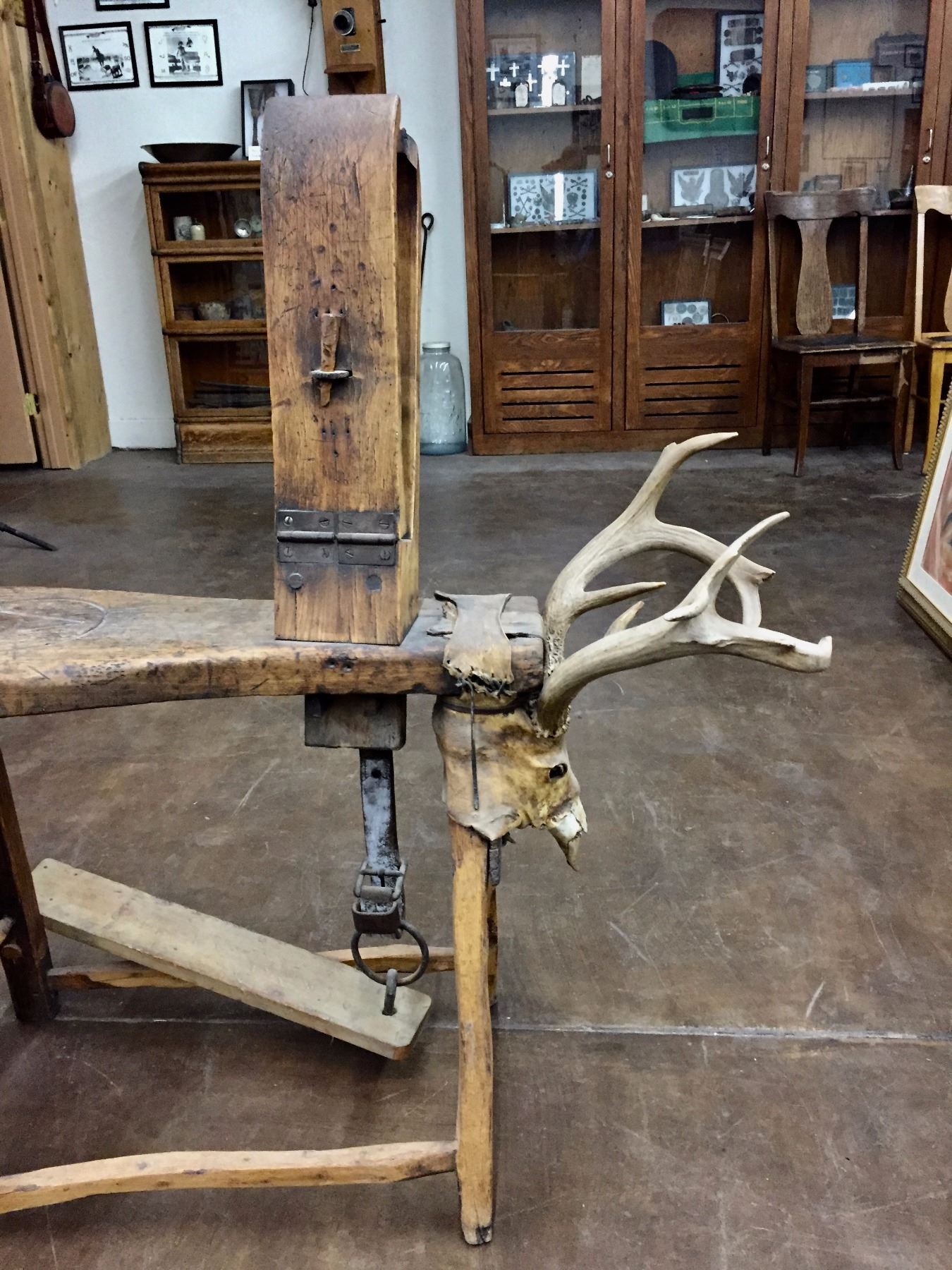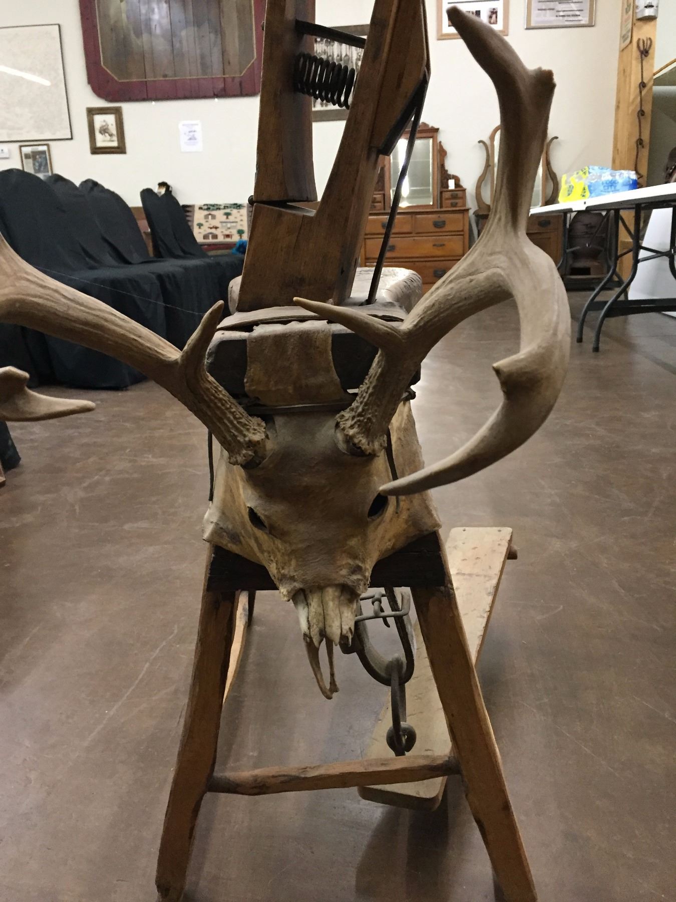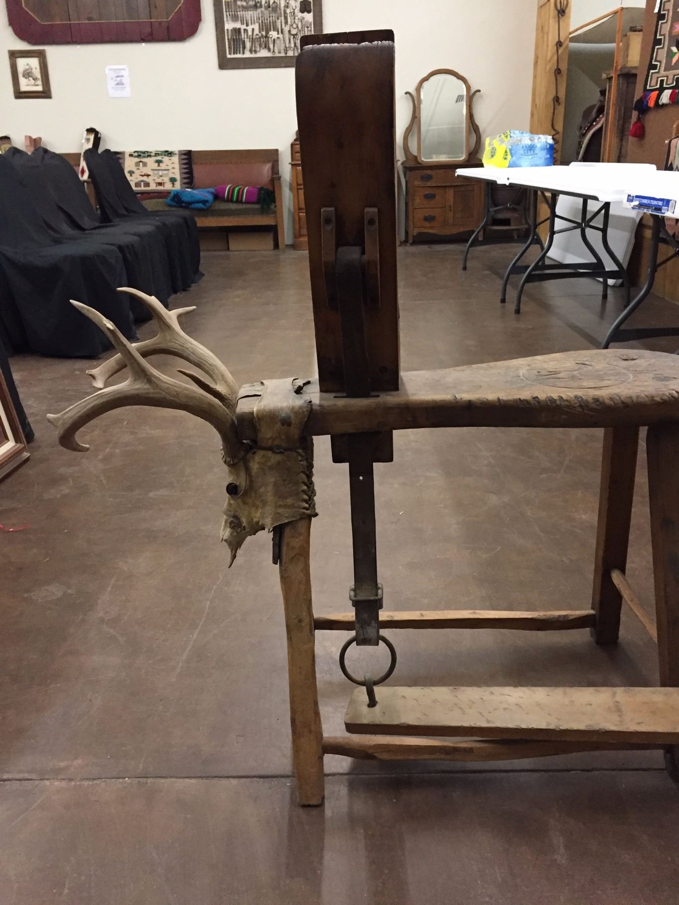 Description: An antique stitching horse with a set of deer antlers mounted on it. Maker: Unknown. Approx. Age: Antique. Size: Measures 36” l x 39” h x 14 1/2” w. Condition: Pretty good for its age, wear expected. Please look closely at the pictures - they are an important part of our description. Shipping: There will be a $15 handling / packaging fee for shipping this lot. The actual cost of postage will be added on top of that.