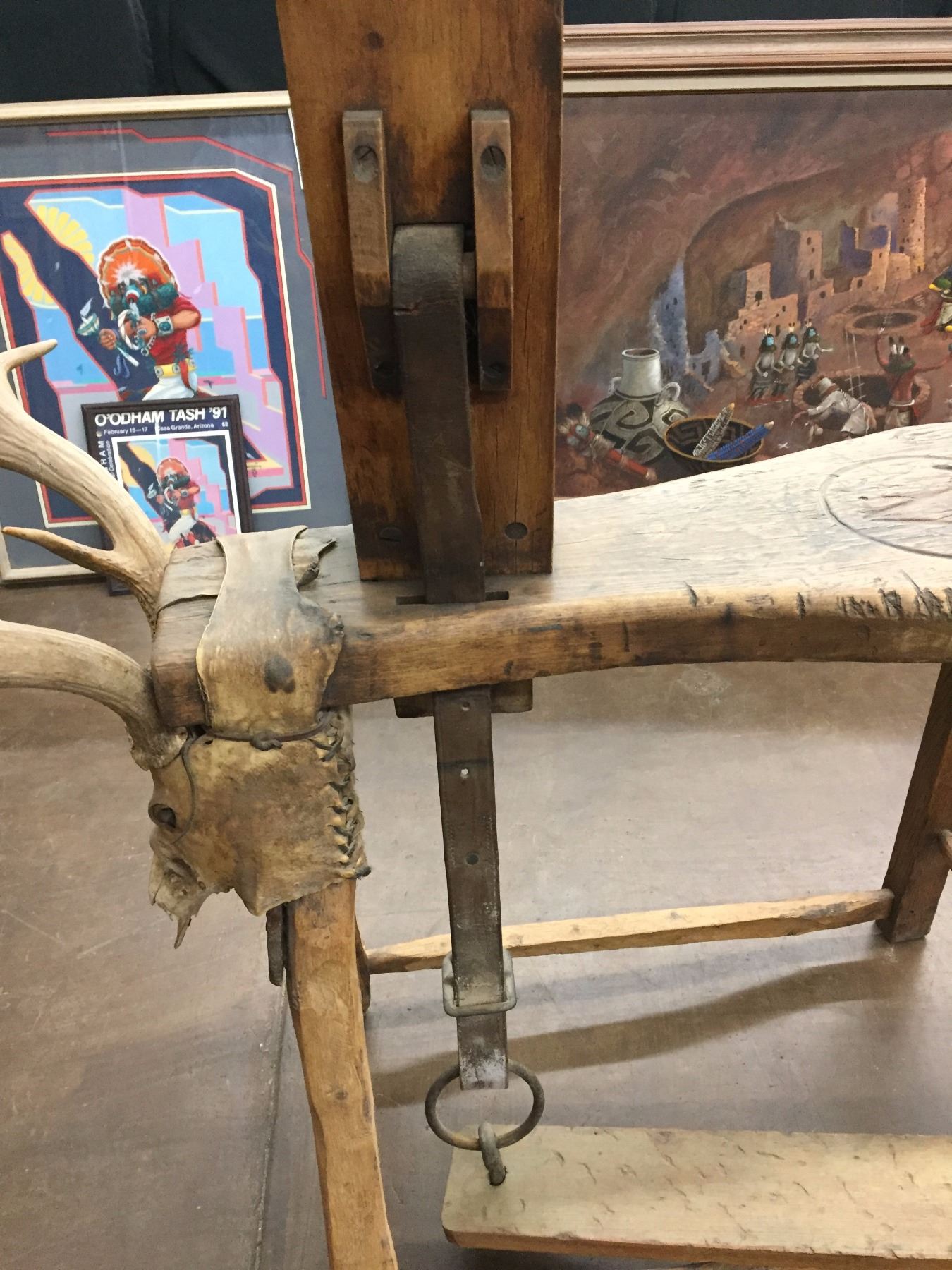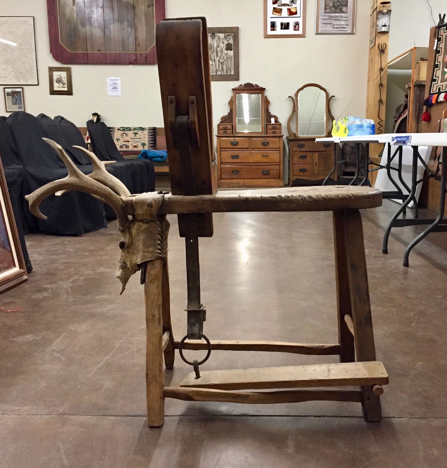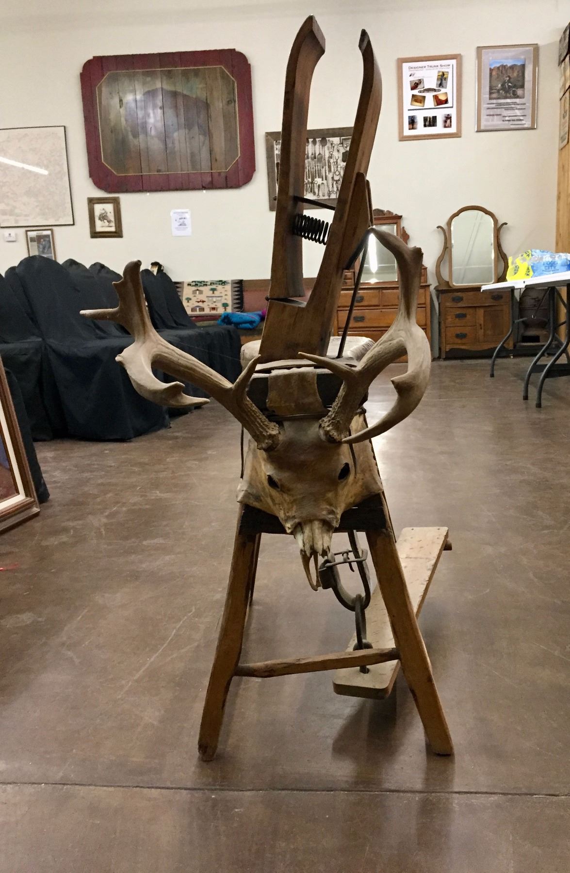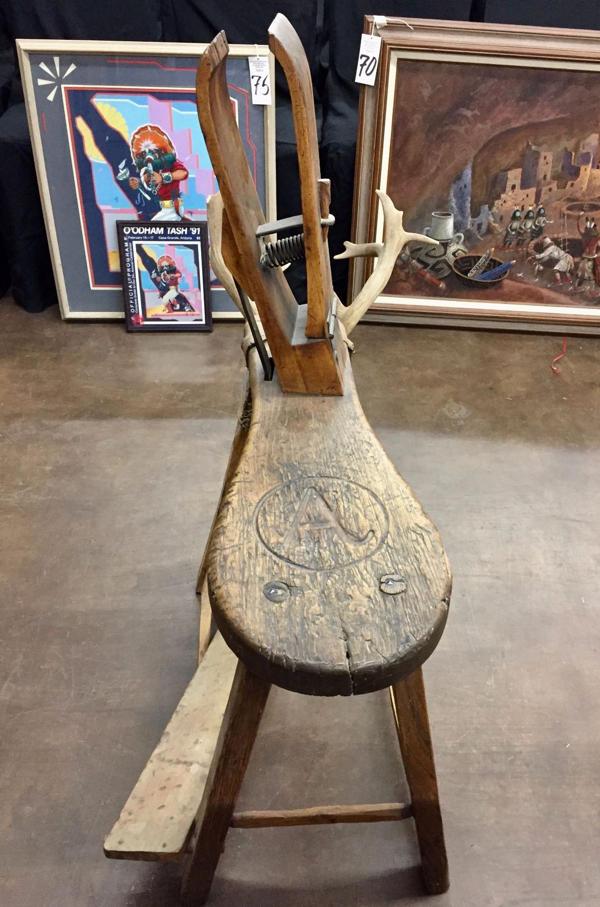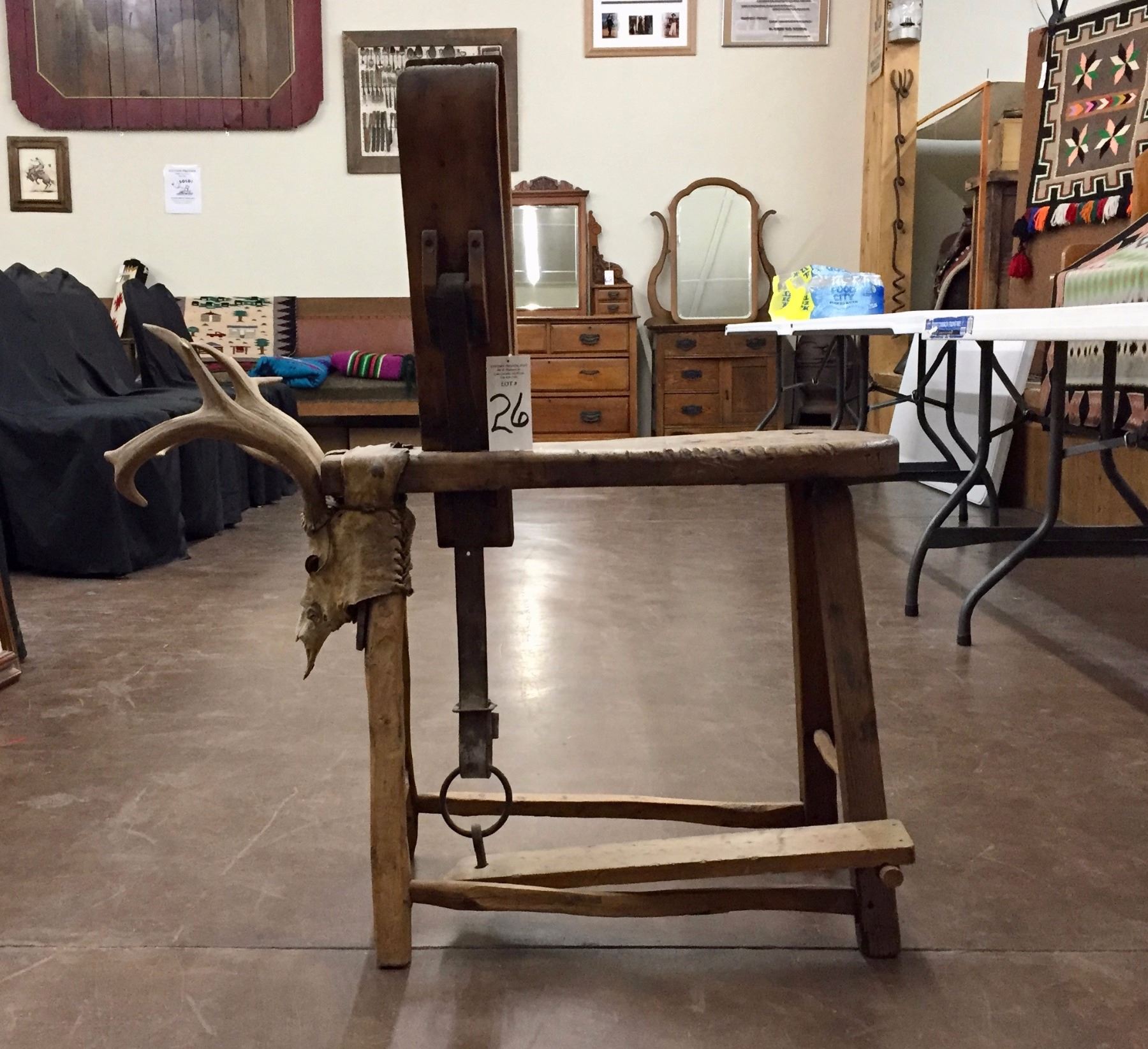 Description: An antique stitching horse with a set of deer antlers mounted on it. Maker: Unknown. Approx. Age: Antique. Size: Measures 36” l x 39” h x 14 1/2” w. Condition: Pretty good for its age, wear expected. Please look closely at the pictures - they are an important part of our description. Shipping: There will be a $15 handling / packaging fee for shipping this lot. The actual cost of postage will be added on top of that.