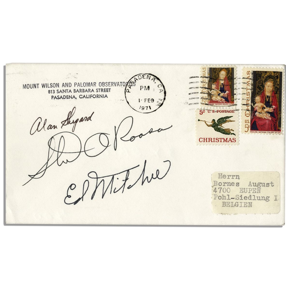 Original Apollo 14 cover, hand-signed by ''Stuart Roosa'' in black ink, and with autopen and secretarial signatures by Ed Mitchell and Alan Shepard respectively. Cover is postmarked from Pasadena, California 1 February 1971, the day after the successful 9-day mission launched. With a Mount Wilson and Palomar Observatories return address, Cover is addressed in type to someone in Belgium. Measures 6.5'' x 3.75 with a few pencil markings to verso, else near fine.