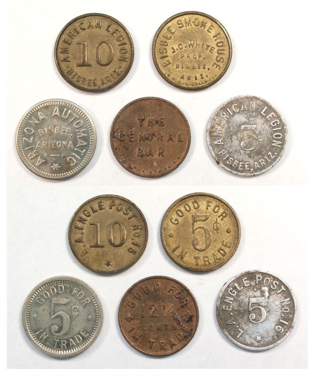(5) ARIZONA AUTOMATIC // 5¢ WM, AMERICAN LEGION 5 Aluminum, AMERICAN LEGION 10 Brass, BISBEE SMOKE HOUSE // 5¢ Brass (Error on Token - L.A. SUB STAMP CO.), THE CENTRAL BAR // 12½ CENTS Brass.
