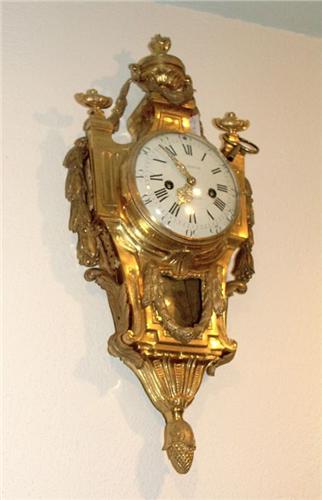 Joli cartel d'applique Louis XVI en bronze ciselé et doré, sonnerie heures et demies au passage, signé LE NEPVEU A PARIS. Cadran en émail blanc à chiffres romains et arabes, mouvement carré, balancier suspension à fil, 15 jours de marche, en très bon état