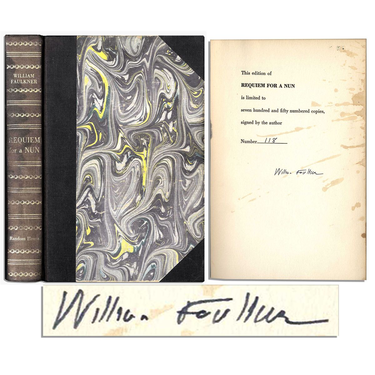 Author-signed, limited edition of William Faulkner's novel/play hybrid ''Requiem For A Nun.'' Random House: New York: 1951. Number 118 of 750 copies, signed ''William Faulkner'' on the fly-leaf. Original, marbled boards with gilt lettering. 286pp. book measures 5.5'' x 8.25''. Wear along backstrip and dampstaining on front free endpaper, fly-leaf and along fore edge. Inscription from previous owner on front free endpaper. Very good condition with a tight binding.