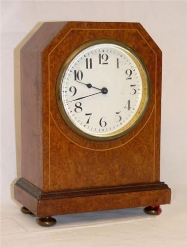 Jolie pendule 8 jours à poser, en bois marqueté et lunette en laiton, cadran en émail, aiguilles en acier bleui, échappement à cylindre, en bon état, env. 1900