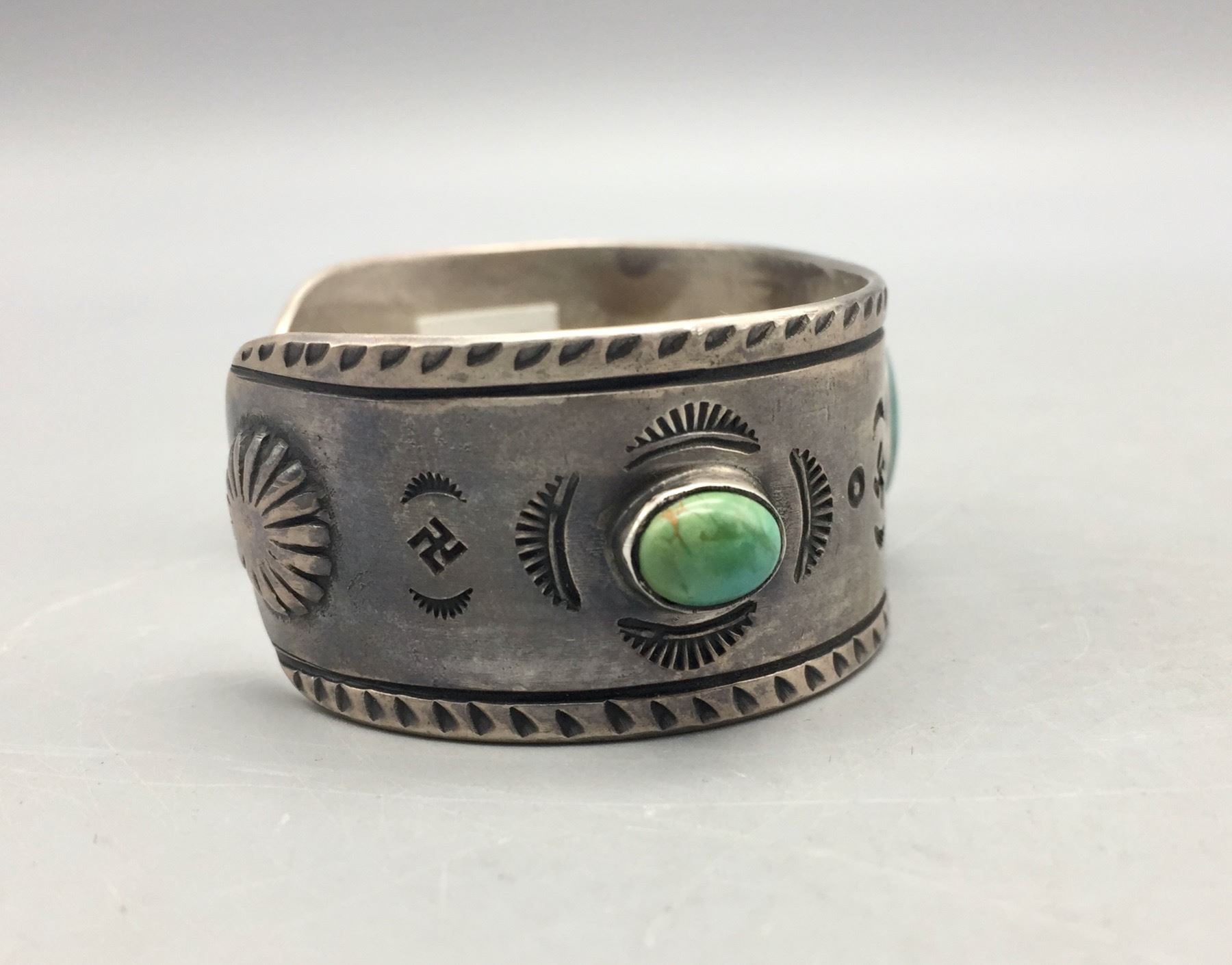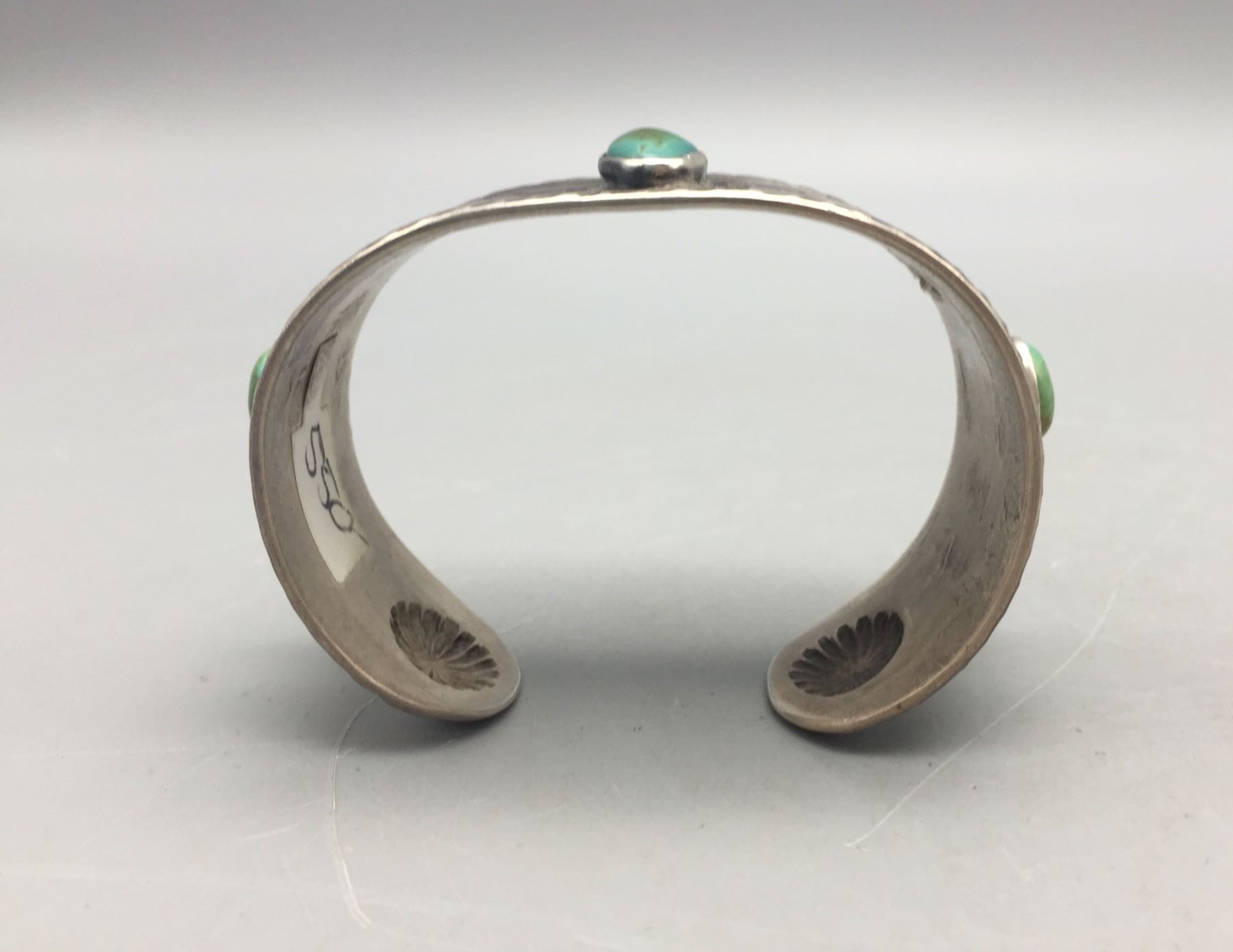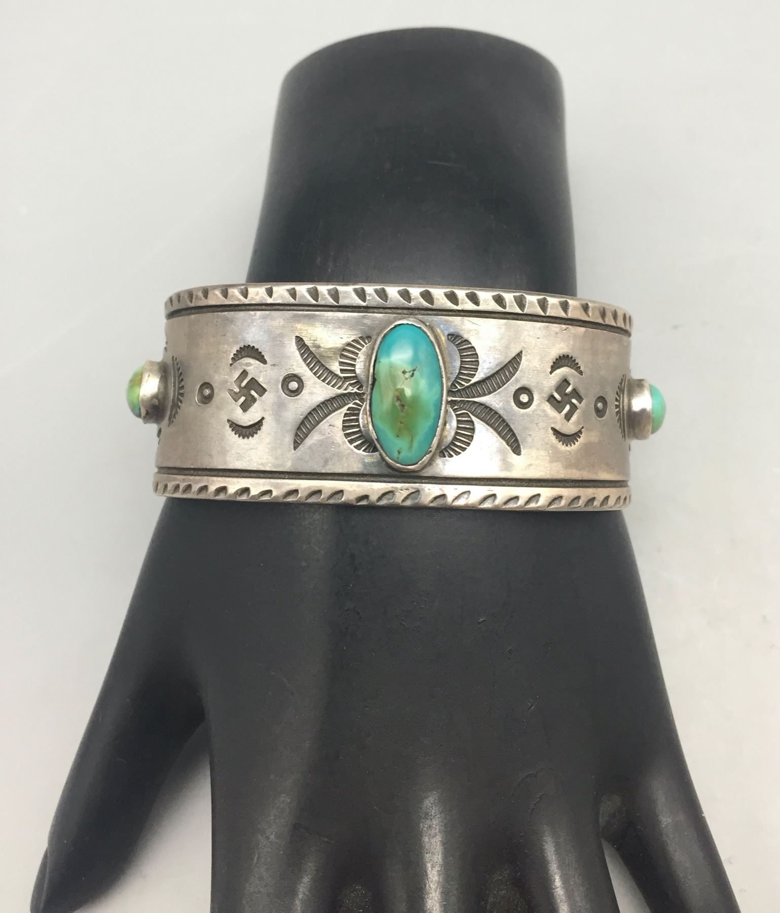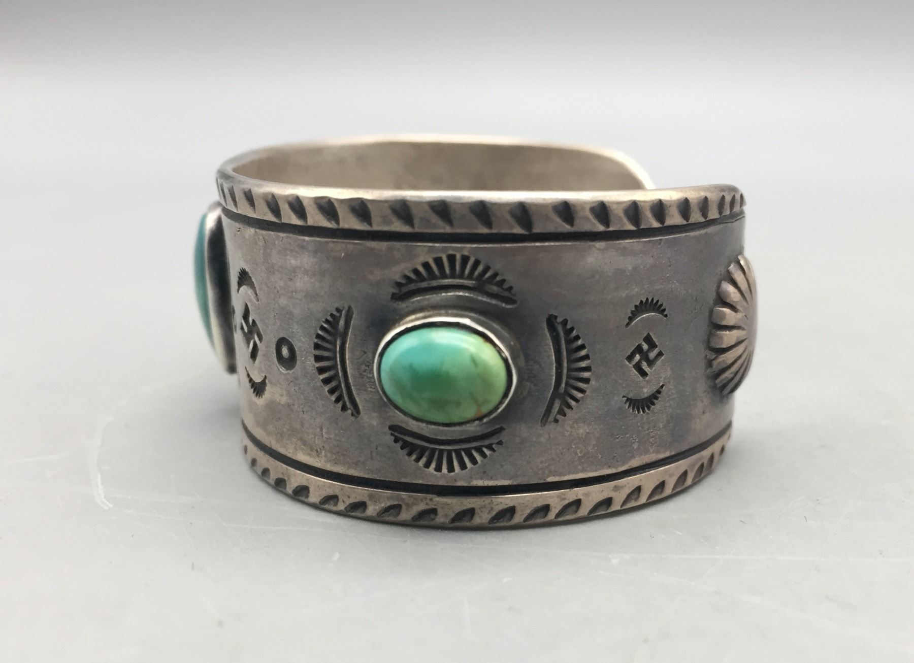 Description: For sale in this lot is a silver bracelet featuring nice green turquoise stones adorned with the whirling logs. Completely handmade in the old-school, hammered ingot method of turn-of-the-century style bracelets. It is stamped as being coin (.900) silver. Maker: Red Rabbit, Mike French. Approx. Age: New retro in style. Size:Inside circumference measures 5 3/4" plus there is a 7/8" opening (making this bracelet fit an approx. 6 5/8" wrist). It is 1" wide across the face and weighs 63.0 g. Condition: Good for its age. Please look closely at the pictures - they are an important part of our description. Shipping: There will be a $5 handling / packaging fee for shipping this lot. The actual cost of postage will be added on top of that.