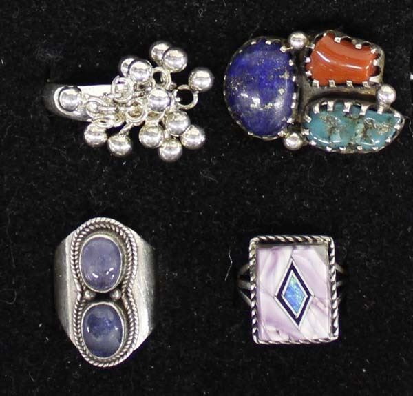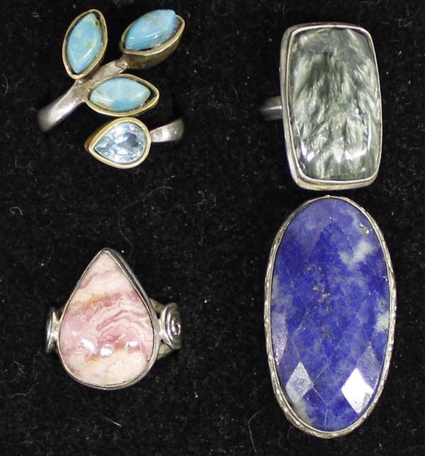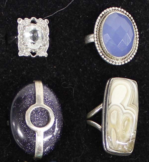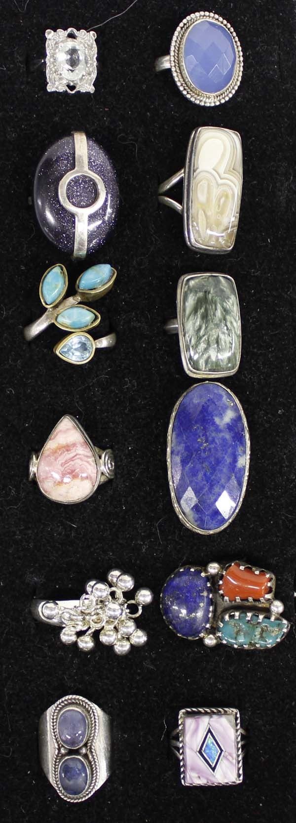 Nice Collection of Sterling Silver Rings, sizes vary from 5.5 to 8, longest ring measures 1.25''L, includes lapis, turquoise, moonstone, blue sunstone, crazy lace agate, rhodochrosite, coral, blue topaz, aquamarine, and moss agate, nice variety with lots of color