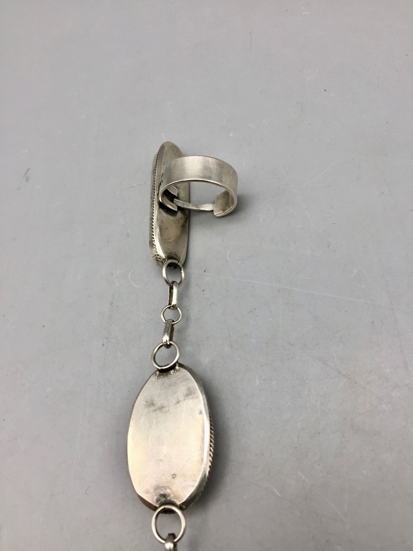 Description: Featured in this lot is a very nice, contemporary slave bracelet featuring nice turquoise stones. Tested as sterling silver. The term slave bracelet refers to a type of jewelry that has a chain or other attachment from the bracelet to one or more finger rings. This fashion originated in Africa and was likely adopted by Native Americans for tourists after the bracelets became popular in the 1920s American culture. Marked as .925 (sterling silver). Maker: Although this has a hallmark, the exact maker is unknown. Approx. Age: Contemporary. Size: Ring size is 7-1/2. Bracelet measures 5-3/8” with a 1-1/4” opening, (fits a 6-5/8” wrist). Condition: Good for its age, normal wear expected. Please look closely at the pictures - they are an important part of our description. Shipping: There will be a $5 handling / packaging fee for shipping this lot. The actual cost of postage will be added on top of that.