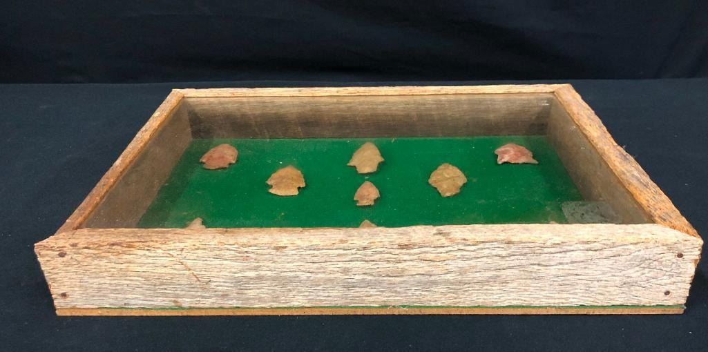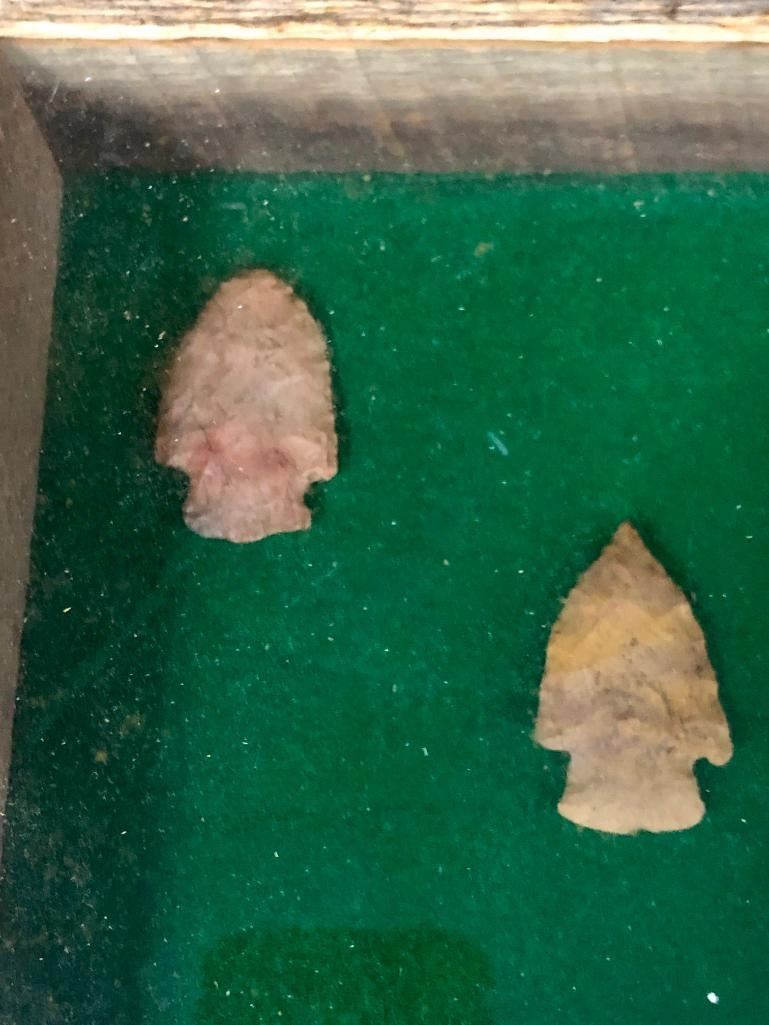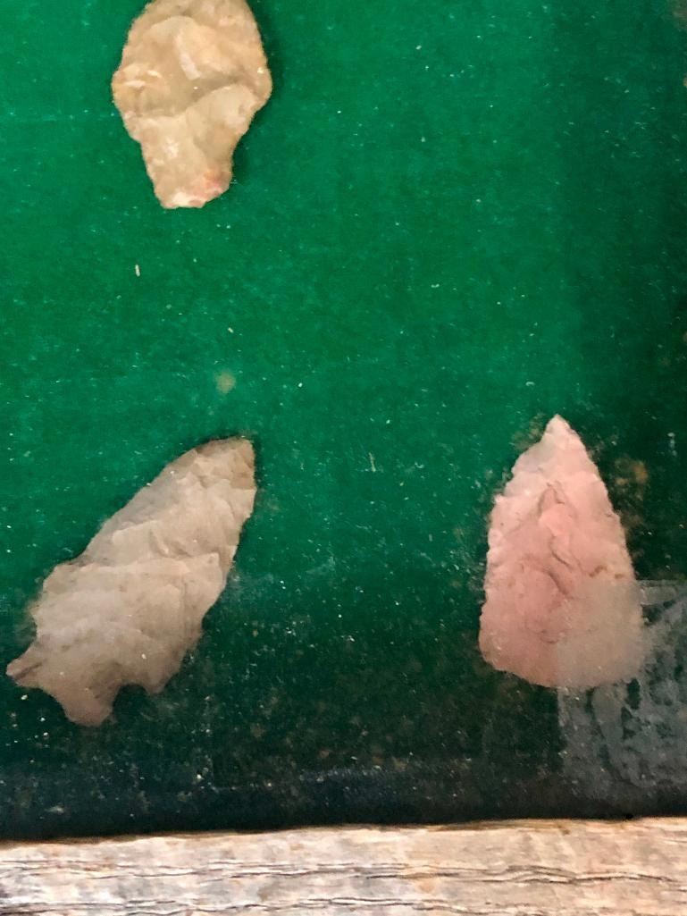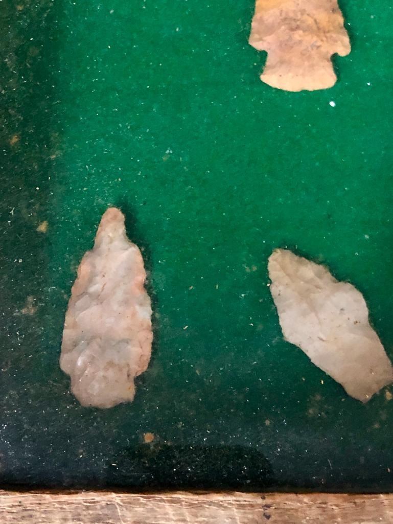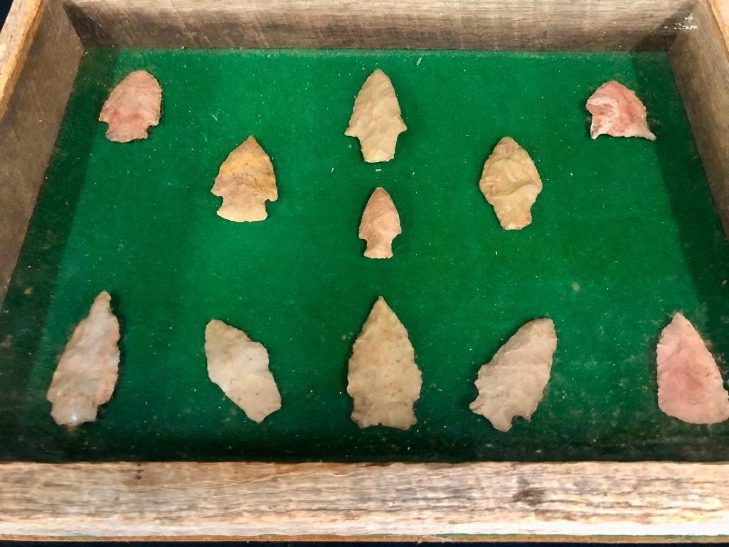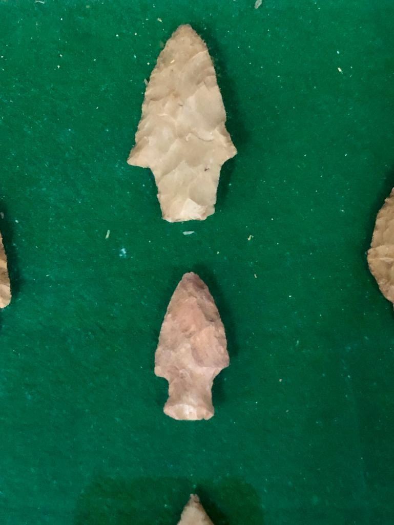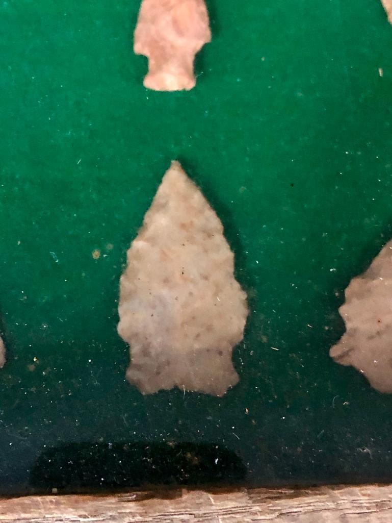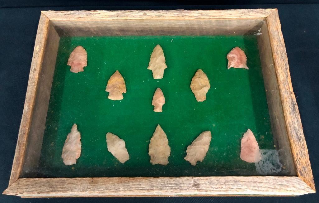 For sale in this lot is a group of 11 Plains arrowheads/points in various sizes. They are nicely displayed in a frame. MAKER: Unknown. APPROX AGE: Pre-historic to historic era. SIZE: Display is 14-7/8 inches wide x 11 inches tall. CONDITION: As found. Please look closely at the pictures as they are an important part of our description and are hereby incorporated into the description, specifically with regards to condition. SHIPPING: There will be a $10 handling / packaging fee for shipping this lot. The actual cost of postage will be added on top of that. BUY IT NOW: If you would like to buy this item now, without waiting for the auction day to bid on it, we do offer this option (which is available up to 48 hours before the actual auction starts). The “Buy it Now†price is the high estimate of this lot (plus applicable fees and the Buyer's premium is discounted to 10% when using the Buy it Now option). If you would like to exercise this option, you must contact us by email (or phone as long as you talk to someone live). Reference this lot number and your intention to "Buy it Now."