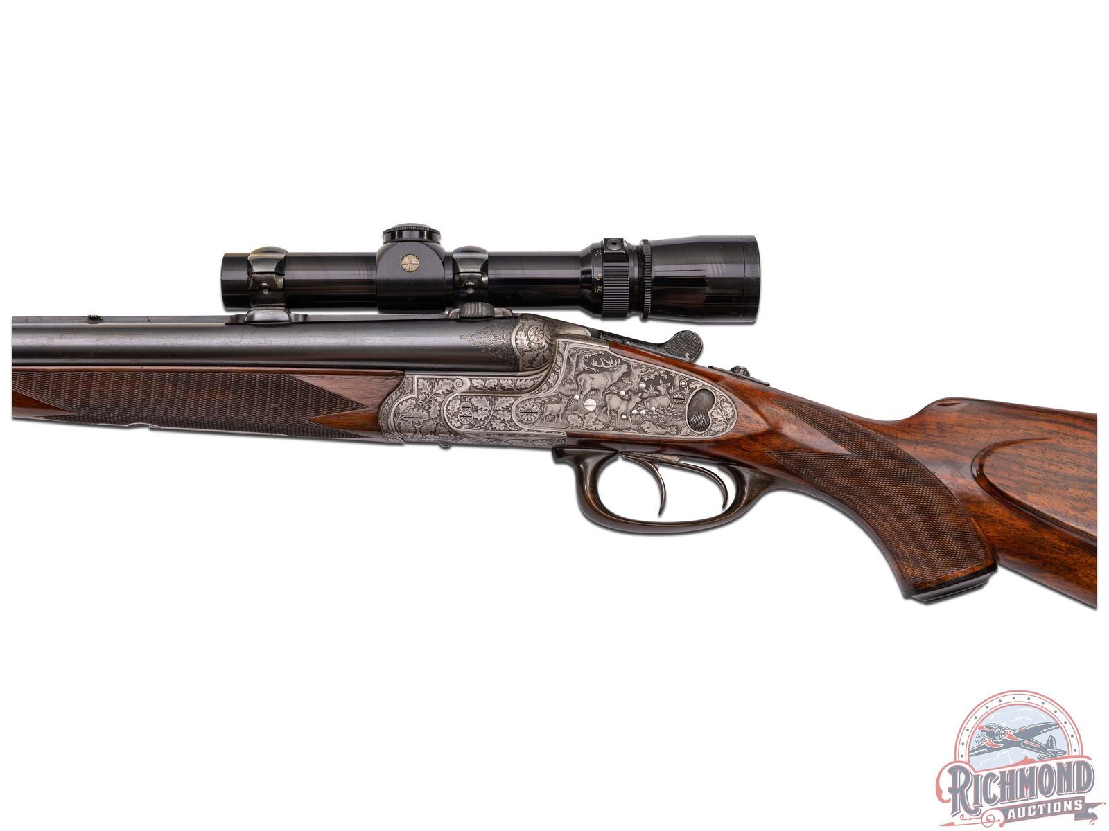 Manufactured in Suhl, Germany in 1942 by Friedrich Wil Helm Kessler. Features 24-3/8" blued Krupp steel barrels with Nazi-Era proof marks, raised matted rib, rifle sights and extractors. 16 gauge side by side barrels over 8x57 JR caliber rifle. Barrels have 2-9/16" chambers with Full and Modified chokes. Splinter forearm with latch release. Full game scene engraved coin finished sidelock action with sideclips. Greener style safety and crossbolt, cocking indicators and top tang rifle selector. Action is controlled by double triggers (front being a set) with a horn trigger guard. Action is engraved with a buck and fox scene on right and Hirsch scene on left with "F.W. Kessler / Suhl" on bottom surrounded by oak leaf pattern. Fine checkered pistol grip walnut stock with right hand cheekpiece, horn butt plate, and grip cap and bow type sling swivel. Equipped with a claw mounted Leupold 1.5-5x Scope. LOP: 13-3/4". DAC: 1-1/4". DAH: 1-1/2". CALIBER: 16x16 / 8x57 JR. S/N: 35791. FFL STATUS: Curio & Relic.