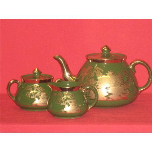 This is a very nice tea set consist of teapot- creamer- covered sugar bowl with oriental scene decoration on. The color is very nice deep green and gold painting. They are in good condition( only the creamer's handle is broken and glued back on and some normal gold wear). Teapot(H:5.1/2"base to top of finial -W:9"spout to handle - D:6"on base) Sugar bowl(H:4" base to top of finial- W: 5.1/2" handle to handle- D:4: base to top of finial) Creamer(H:3" -W:4.1/2" spout to handle- D:3.3/4" on base).
