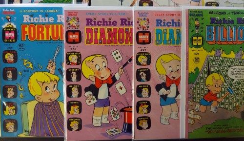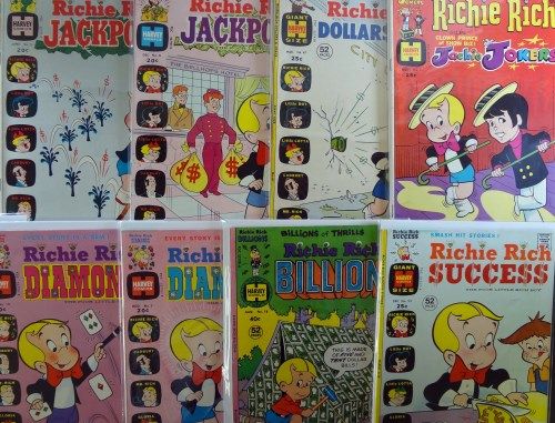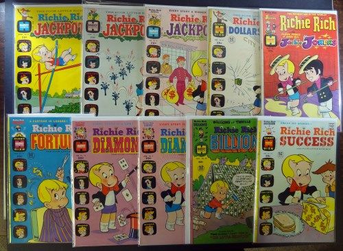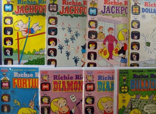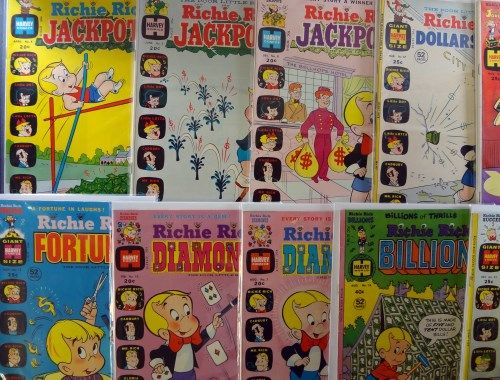 Includes: Jackpots #4 April 1973 "VG-F". Jackpots #5 June 1973 "VG-F". Jackpots #8 Dec 1973 "VF", Success #53 Dec 1973 "F+ to VF", Jackie Jokers #1 Nov 1973 "Fine". Billions #18 Aug 1977 "Fine+", Diamonds #7 Aug 1973 "Fine to Very Fine". Diamonds #10 Feb 1973 "Fine+". Fortunes #13 Nov 1973 "Fine". Dollars and Cents #47 March 1972 "Very Fine". Total Overstreet Book Value Adjusted for Condition $90.00. Est. Value $90.00 - $110.00.