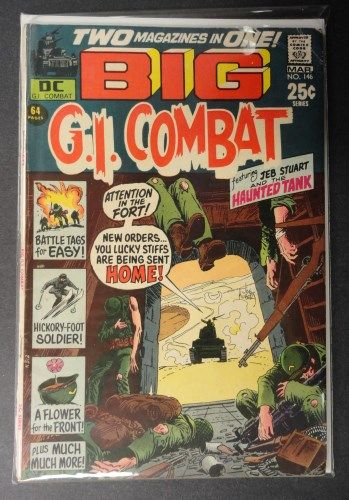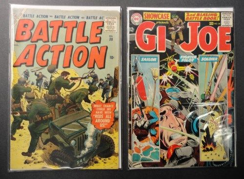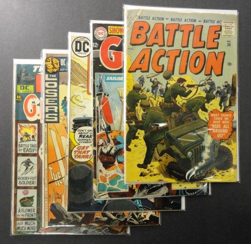 Includes: Showcase #54 Feb. 1965 "Good" (Water Stain at Bottom of Spine). G.I. Combat #146 March 1971 Solid "VG". Our Fighting Forces #135 Feb. 1972 "VG-F". Our Fighting Forces #146 Jan 1974 "VG" Battle Action #30 August 1957 "G-VG" (Cover Chipping, Very Small Piece out of Back Cover at Top of Spine) Total Overstreet Book Value (Adjusted for Condition) $52.00. Est. Value $55.00 - $75.00.