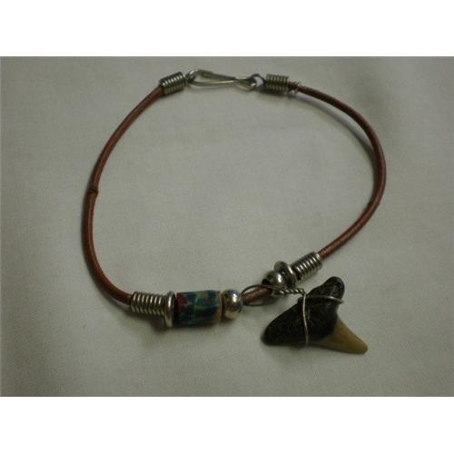 Nice Hand Made Leather and Shark Tooth Bracelet. This is a real nice hand made bracelet. It measures approximately 8" in length. It has a hook and loop clasp. Decorated with a dangling shark tooth flanked with beads and twisted wire. A very lovely piece. Great gift item! "FREE SHIPPING" IN USA ON THIS ONE.