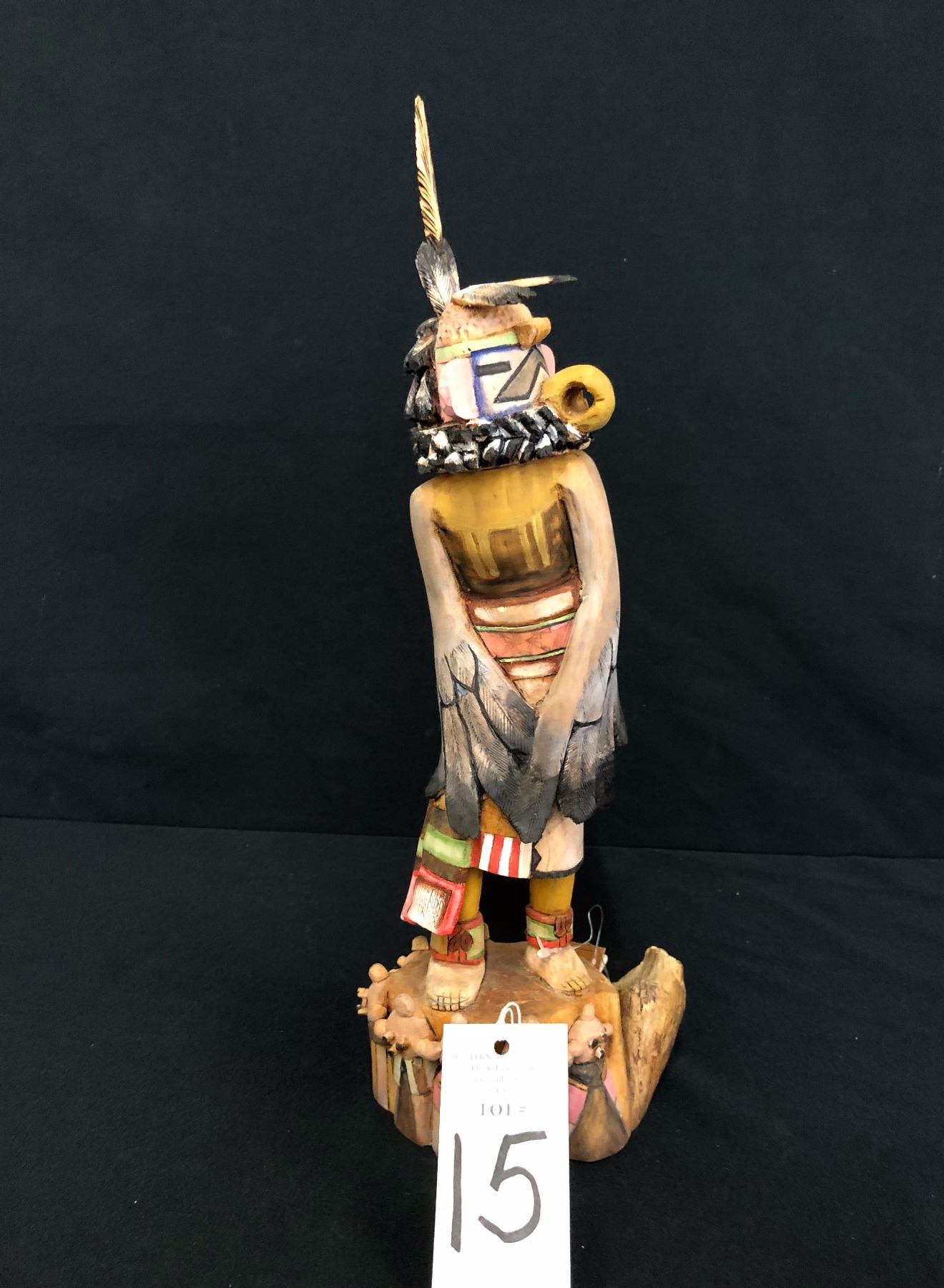 Maker: T. Frederick, Hopi. Approx. Age: Fairly modern. Size: Base is 6” at it’s widest and it’s 17” tall. Additional Info: A nice Hand-carved/hand-painted Hopi Kachina. Condition: Good. Please look closely at the pictures - they are an important part of our description. Shipping: There will be a $10 handling / packaging fee for shipping this lot. The actual cost of postage will be added on top of that.