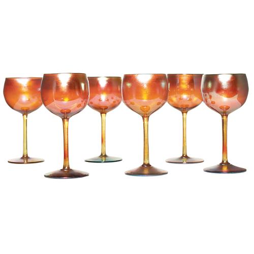 Nice L.C. Tiffany glasses, good matching set of six, favrile glass with amber, red and green iridescence, most signed and numbered, 5.75"h
