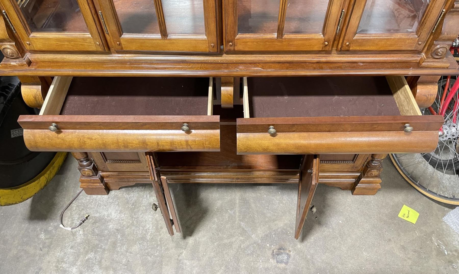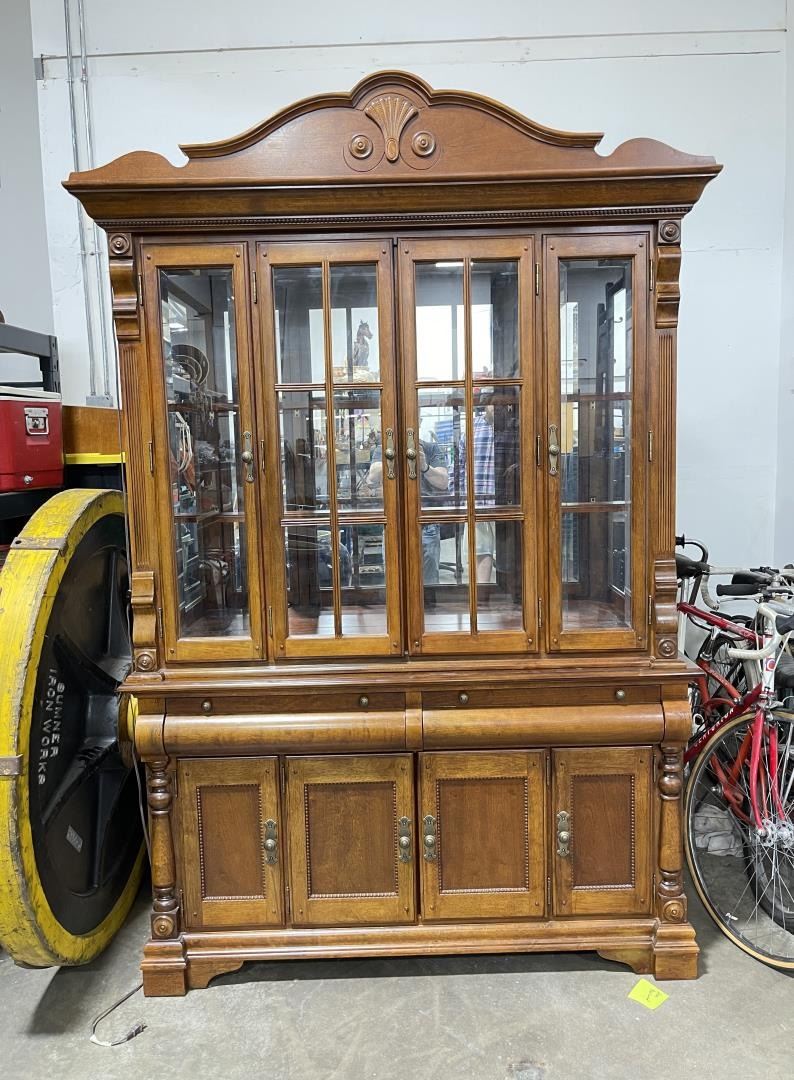 Very nice cabinet. Two piece. Glass Shelves, Mirrored back. 90" tall, 58.5" long, 16.5" deep.