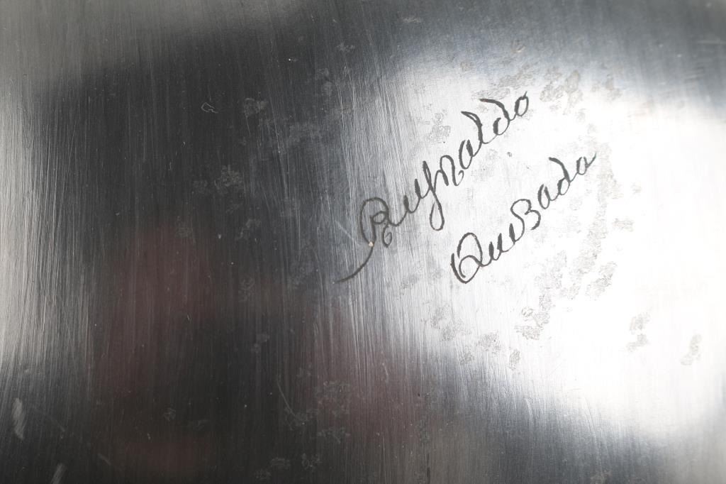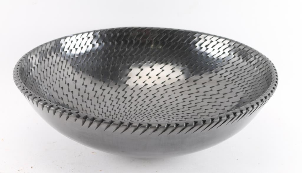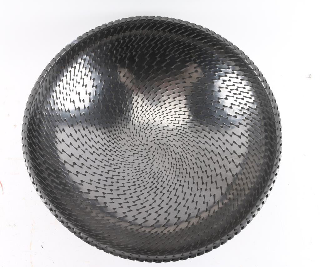 (1) Pottery by Reynaldo Quezada, signed, 14" circumference, in good condition. He is Juan Quezada's youngest brother. Reynaldo learned the art of making pottery from Juan and his brother Nicolas. Reynaldo's first claim to fame came from his experiments with mixing clays and producing marbleized ollas. His second claim to fame comes from the graphite-polished black bowls, vases and flying-saucers with corrugated surfaces that he produces.