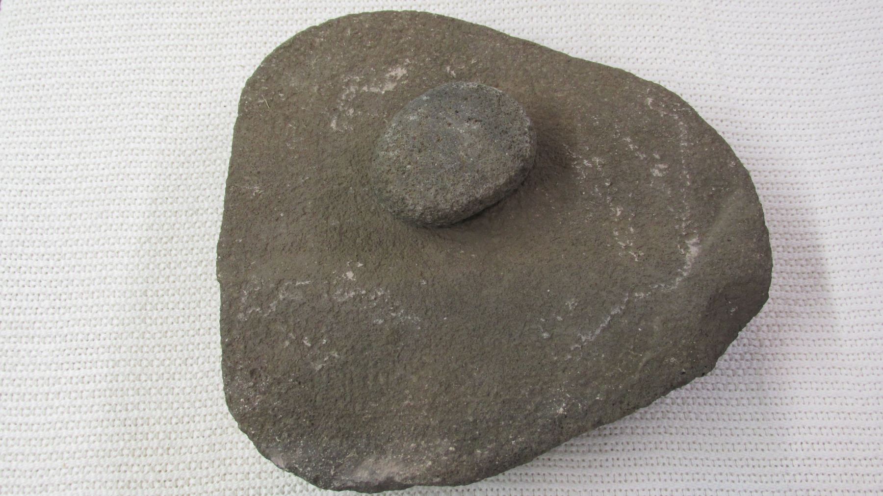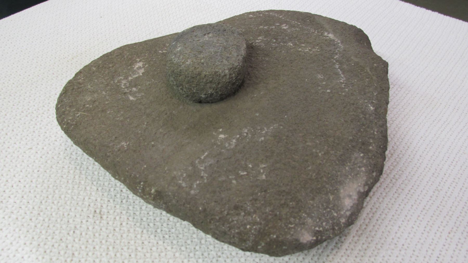 Nice large stone metate bowl with grinder. Arizona. Approximately 14" x 13".