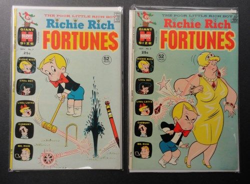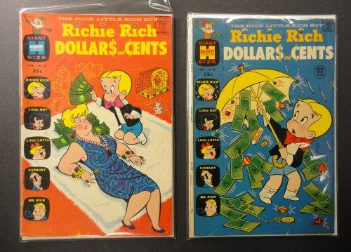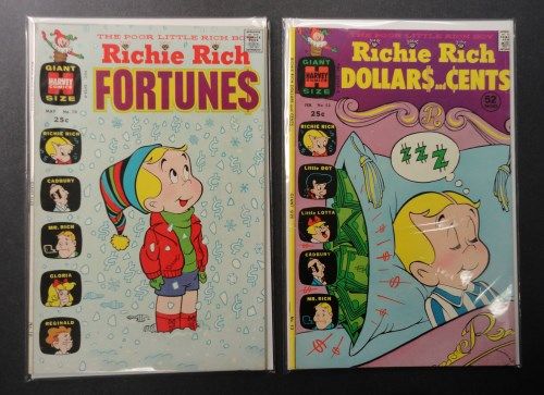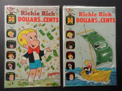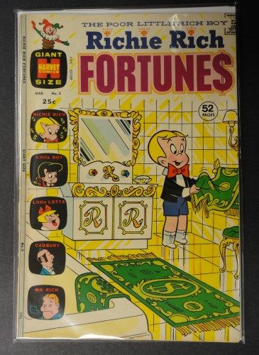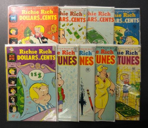 Includes: Richie Rich Fortunes #3, #5, #7, #10. Richie Rich Dollars and Cents #24 (VG), #29 (VG), #45 (VG), #48 (VG), #53. Mostly from 1971 & 1972. Total Overstreet Book Value Adjusted for Condition Approximately $80.00. Est. Value $80.00 - $100.00.