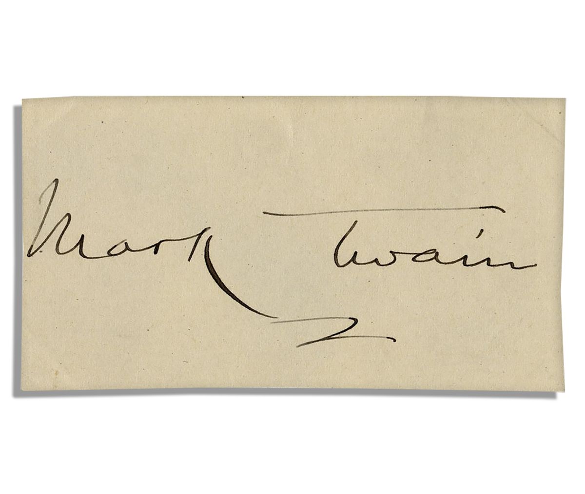 Excellent Samuel Clemens autograph, signed in his famous pen name, ''Mark Twain'' in black ink. Signature is on a small 3.25'' x 1.75'' slip of paper. Minor toning, else fine.
