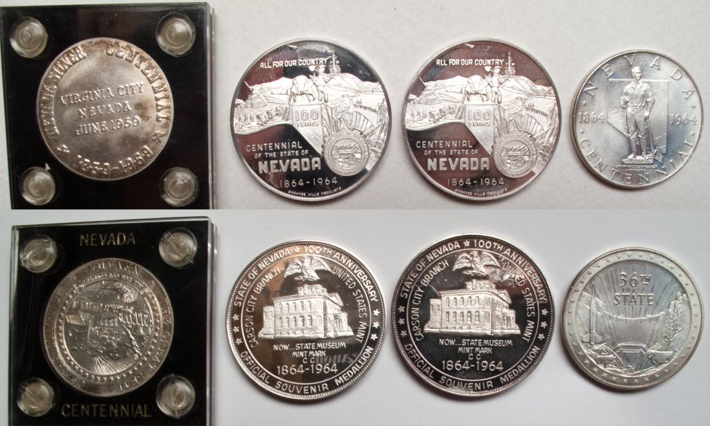 1 and 2) Lot of two 1964 Nevada Centennial. 39mm. .999 fine silver. Printed at the Carson City Mint with a 'CC' mark. Nevada scene on obverse and Carson City Mint of reverse. 3) 1964 33mm centennial so-called dollar. William Sharon miner on obverse and Hoover Dam on reverse with 36TH STATE. 4) 1959 NEVADA SILVER CENTENNIAL on reverse. VIRGINIA CITY JUNE 1959 in middle of coin. Great seal of the state of Nevada on obverse. NICE PIECE!City: County: State: NVDate: