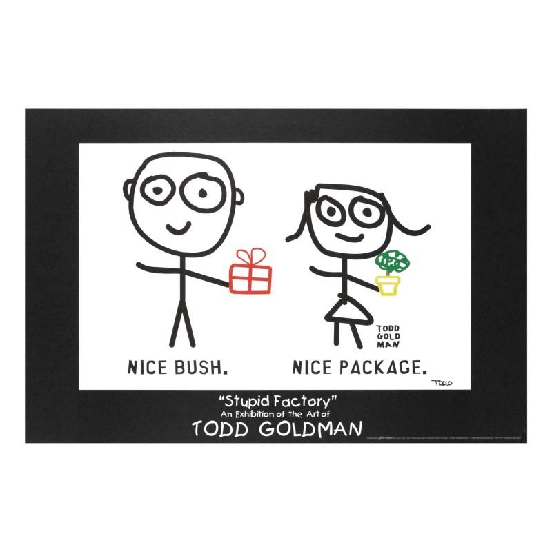 ADD THE IRREVERENT ARTWORK OF WORLD-RENOWNED ARTIST TODD GOLDMAN TO YOUR COLLECTION! Pop artist Todd Goldman is known all across the globe for his whip-smart and wickedly funny puns and pictures! "Nice Package! Nice Bush!" is a fine art litho poster hand signed by Todd. Measures approx. 36" x 24" (poster).