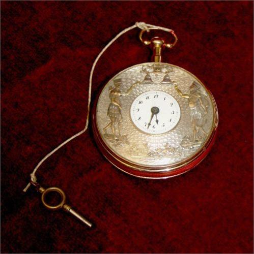 Belle montre de poche Jacquemart, répétition à quart en or rose 18 cts, cadran en argent guilloché, personnage indien d'Amérique en or 3 couleurs frappe les heures et les quarts sur 2 cloches, échappement à verge, fusée et chaîne, vers 1810, en bon état, avec box