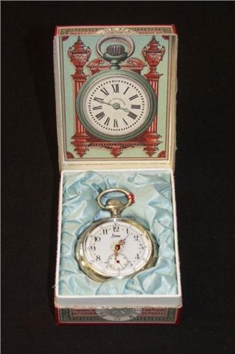 Jolie montre de poche genre Roskopf en métal chromé, cadran émail bleu et blanc avec décor or, petite seconde à 6 heures, échappement cylindre, comme neuve, avec étui, env. 1880