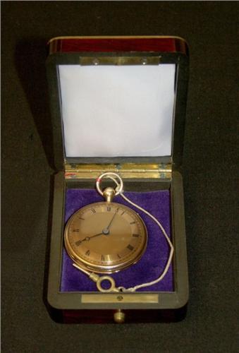 Belle montre de poche répétition quarts, boîte et cadran en or guilloché, chiffres romains, aiguilles Breguet en acier bleui, en très bon état, avec coffret en acajou avec filets et écusson en laiton, vers 1840