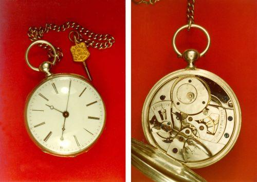 Belle montre de poche en argent, signée GAUCHAT A FLEURIER, No 54, produite pour le marché chinois, cadran en émail à chiffres romains, seconde au centre, mouvement en acier, échappement ancre à 8 rubis, avec sa clé, env. 1850