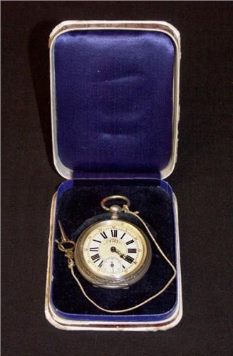 Jolie montre en argent à remontage à clé, cadran en émail peint, boîte guillochée et gravée, mouvement squelette décoré, échappement à cylindre, en bon état avec étui, env. 1850